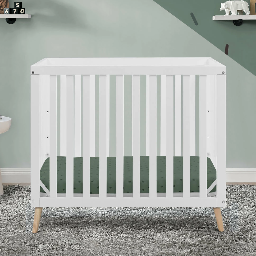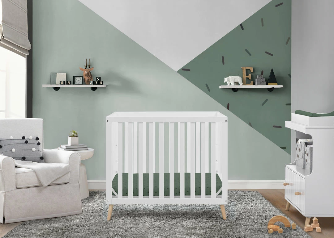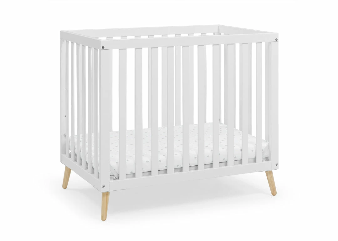 The Essex Convertible Mini Baby Crib with 2.75-Inch Mattress by Delta Children is full of modern style, safety features and craftsmanship, just in a scaled-down size. Designed for urban spaces, smaller nurseries or as a spare crib for grandma and grandpa’s house, this versatile mini crib features angled feet in a natural finish, two adjustable mattress positions that allow you to lower the mattress height as baby grows, plus it includes a comfy, water-resistant crib mattress. Extending its value well past the nursery, the Essex Convertible Mini Baby Crib by Delta Children converts into a twin bed with or without a footboard when the time is right (conversion rail sold separately).