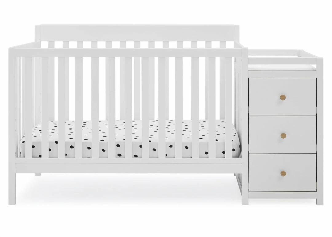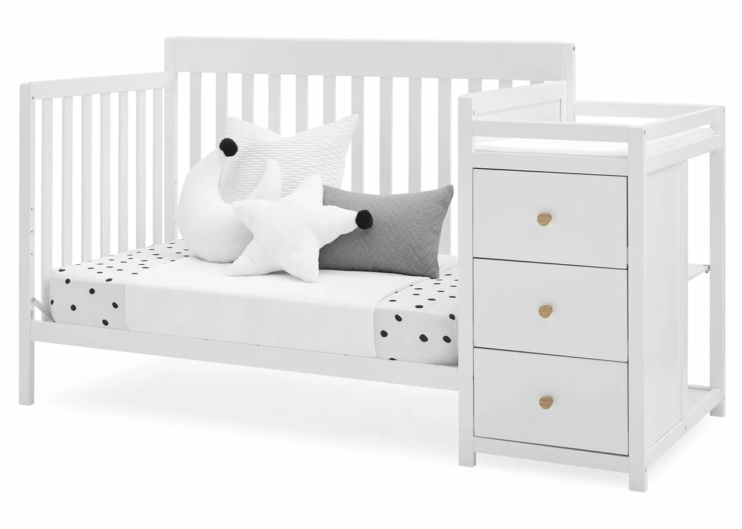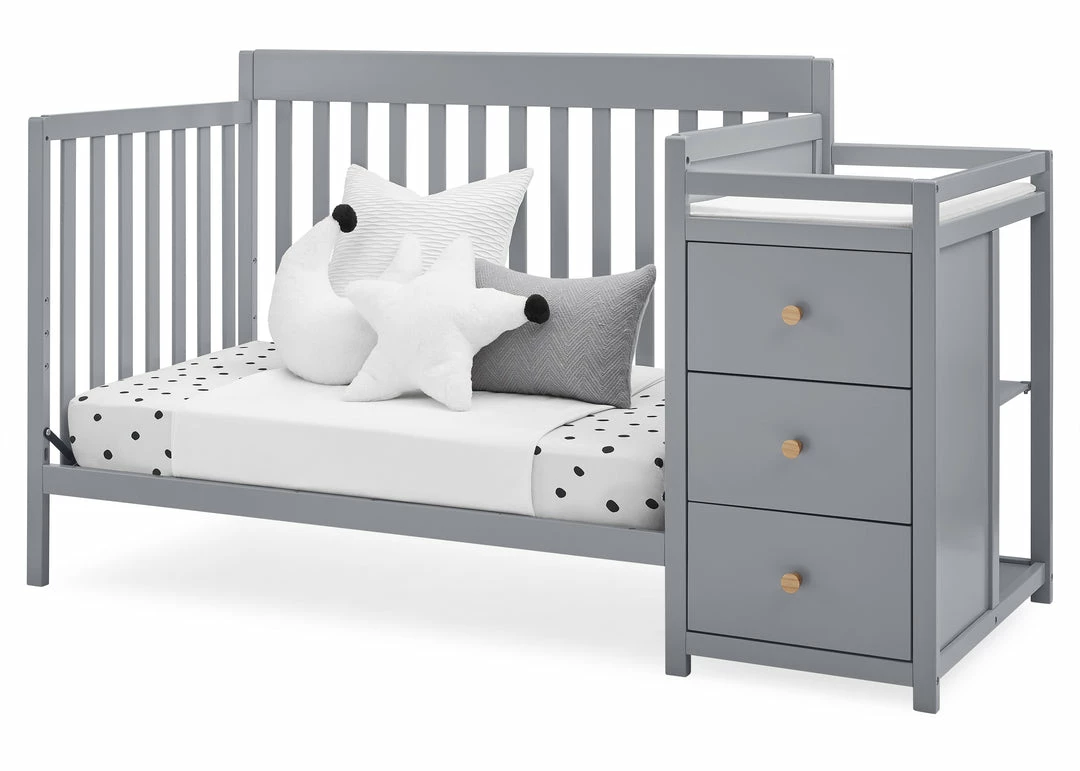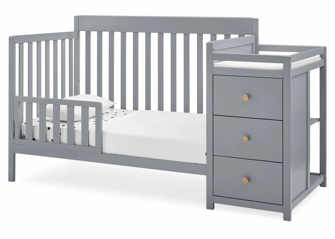 The Flynn 5-in-1 Convertible Crib and Changer by Delta Children is the ideal piece for efficiency and versatility in your baby’s nursery. This crib’s grow-with-me design features three adjustable height levels that allow the crib to be lowered as your child grows, plus it converts from a crib, to a toddler bed, sofa, daybed and full size bed. The attached changing table includes a changing pad on top, then underneath three drawers with modern, natural knobs and two shelves help keep your little one’s essentials within reach. Everything you need to furnish your nursery, the Flynn 6-in-1 Convertible Crib and Changer by Delta Children is a convertible crib, changing table, and storage piece all in one (Daybed/Sofa Rail included; Toddler Guardrail and Full-Size Bed Rails sold separately).