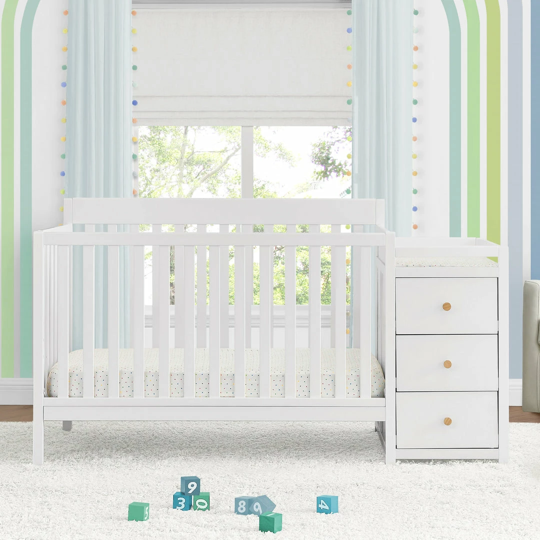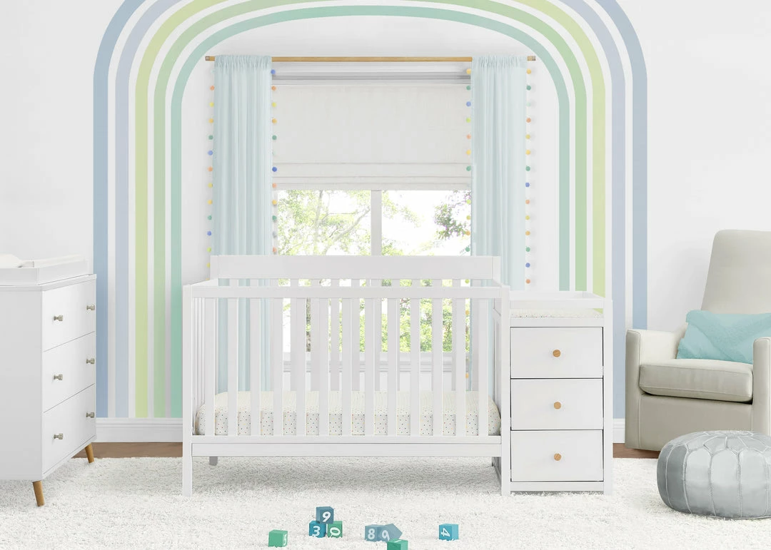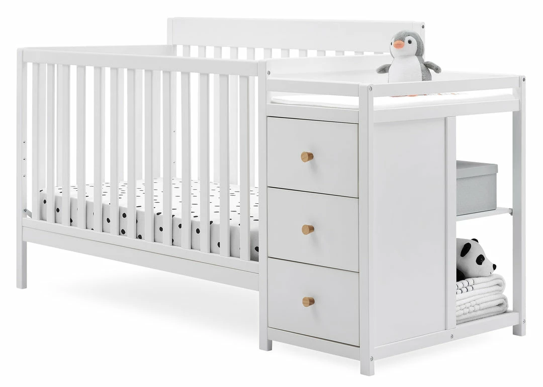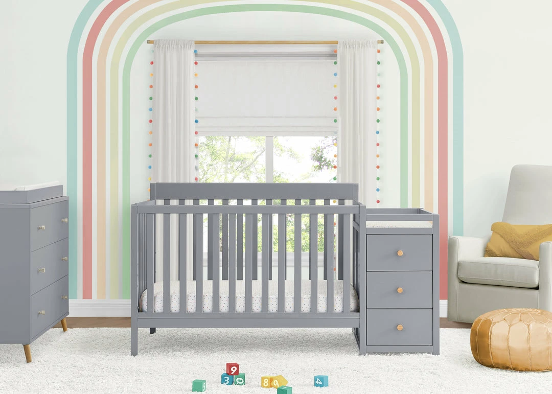 The Flynn 5-in-1 Convertible Crib and Changer by Delta Children is the ideal piece for efficiency and versatility in your baby’s nursery. This crib’s grow-with-me design features three adjustable height levels that allow the crib to be lowered as your child grows, plus it converts from a crib, to a toddler bed, sofa, daybed and full size bed. The attached changing table includes a changing pad on top, then underneath three drawers with modern, natural knobs and two shelves help keep your little one’s essentials within reach. Everything you need to furnish your nursery, the Flynn 6-in-1 Convertible Crib and Changer by Delta Children is a convertible crib, changing table, and storage piece all in one (Daybed/Sofa Rail included; Toddler Guardrail and Full-Size Bed Rails sold separately).