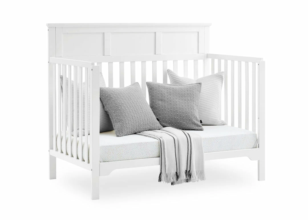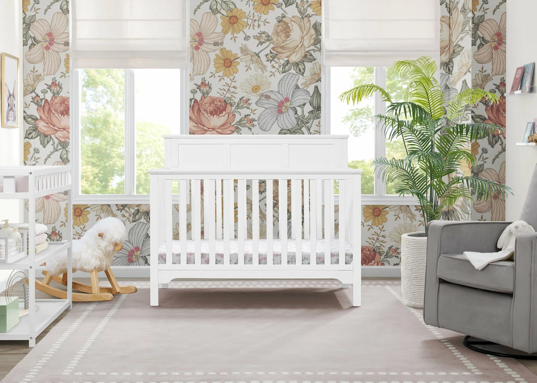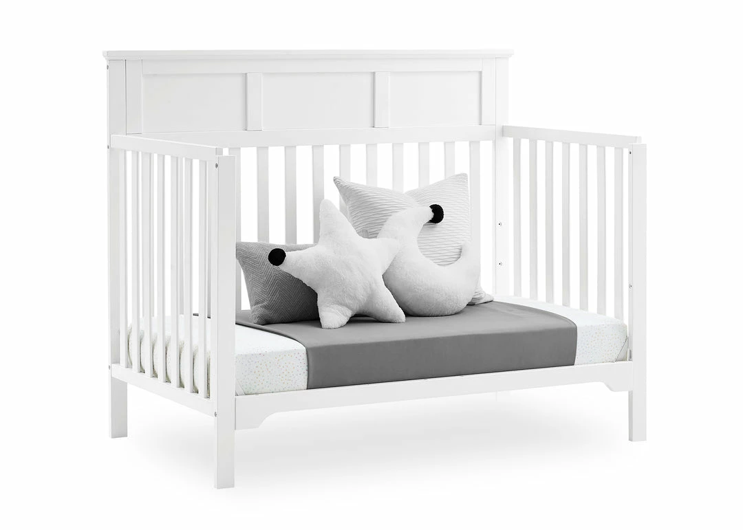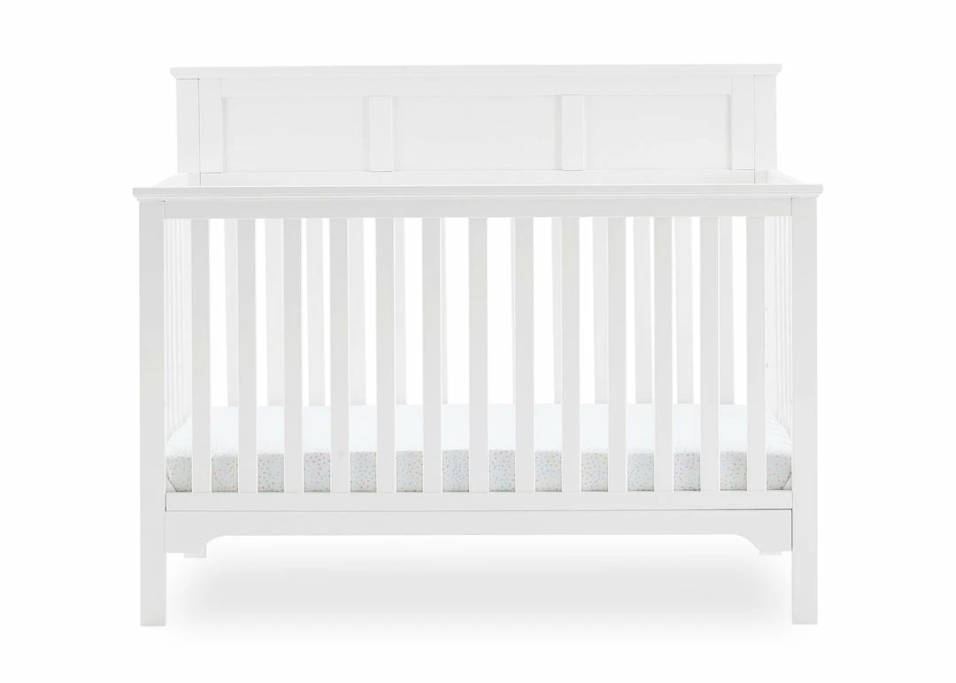 The Sweet Beginnings Hart Flat Top 6-in-1 Convertible Crib by Delta Children is designed to deliver stylish longevity. With detailed molding, this flat-top design is the perfect centerpiece for your nursery. It features three adjustable height levels that allow the crib to be lowered as your child grows, plus it converts from a crib, to a toddler bed, daybed, sofa, full size bed with headboard and footboard or a full size bed with headboard only (Daybed, Sofa Rail included; Toddler Guardrail #0094 and Full Size Bed Rails #0050 sold separately).
