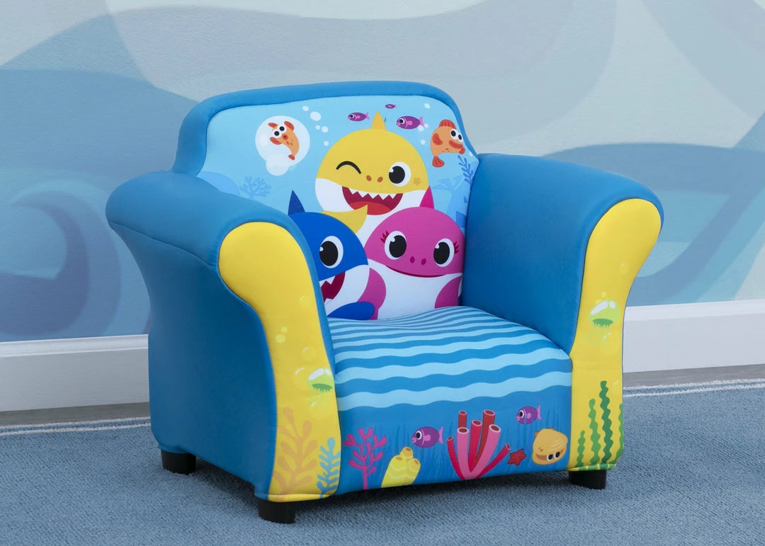 Baby shark, doo, doo, doo, doo, doo, doo! Kids who love the Baby Shark song will love this Baby Shark Upholstered Chair with Sculpted Plastic Frame by Delta Children! A cozy toddler chair, it features a durable, plastic frame and padded slipcover that showcases colorful graphics of Baby Shark, Mommy Shark, Daddy Shark, Grandma Shark and Grandpa Shark. A cozy chair made for all-day comfort, it’s the ideal seat for reading, watching movies or just relaxing. Some assembly required.