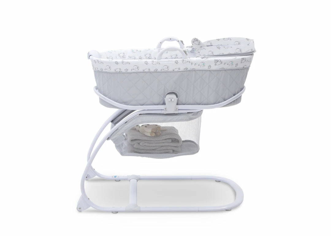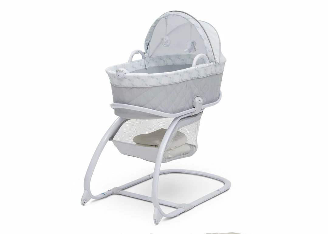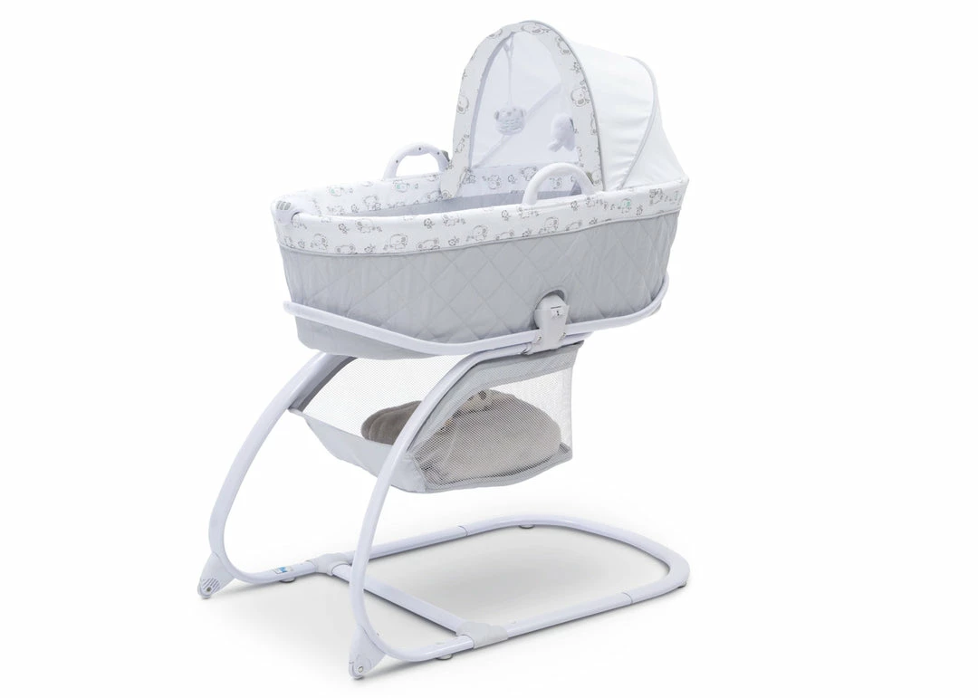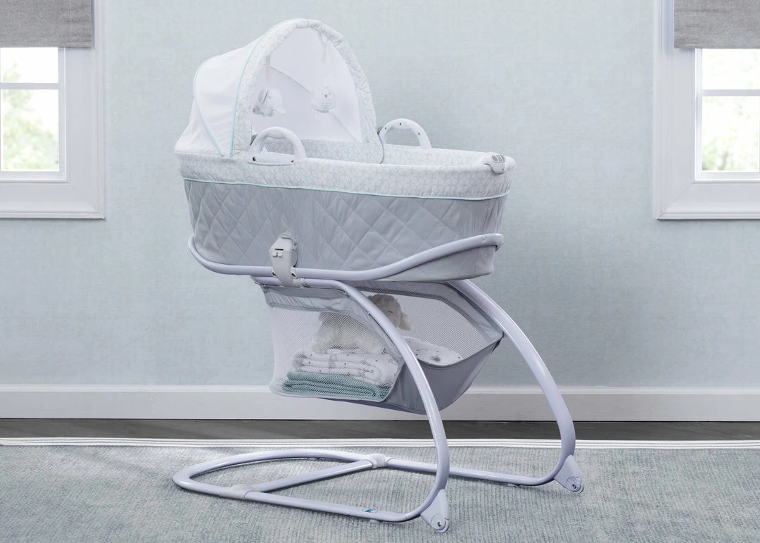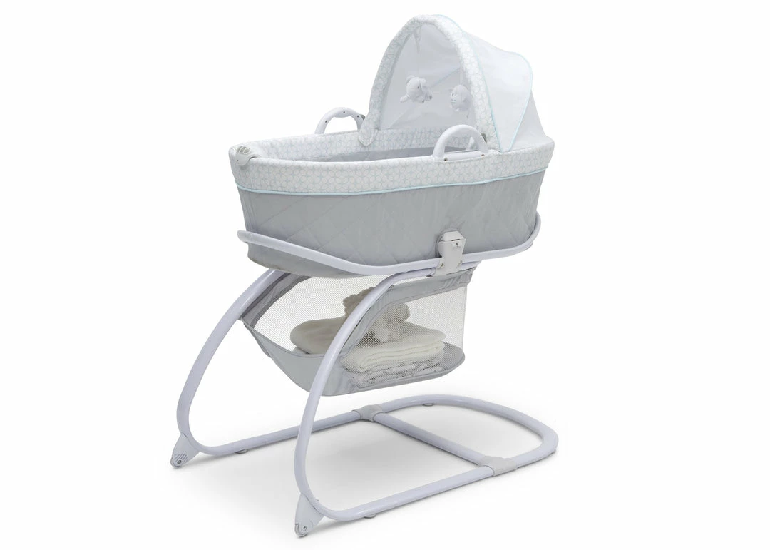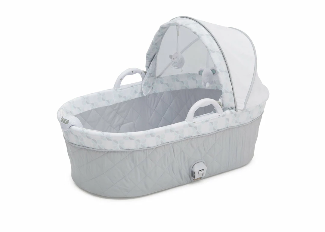 The Deluxe Moses Bassinet from Delta Children is a comfortable sleep space for newborns that combines a Moses basket with a standard bassinet. The adorable Moses basket safely attaches to the bassinet frame, and can be easily removed, so you can keep your baby nearby as you move around the house. To calm your newborn, the attached electronic pod plays peaceful music or emits gentle vibrations while two plush hanging toys attached to the canopy will stimulate Baby’s visual senses if they wake. A soft nightlight will help you check in on your little one without disturbing them, and an easy-to-reach storage basket keeps blankets, diapers or other supplies nearby. The bassinet’s adjustable canopy offers light blocking protection for daytime naps. A great first sleep space for your baby, the Deluxe Moses Bassinet from Delta Children is a versatile option that works in your bedroom, the living room, the kitchen, or anywhere else in the house you may go.