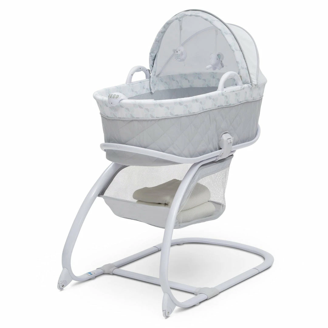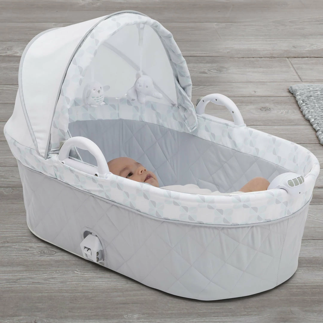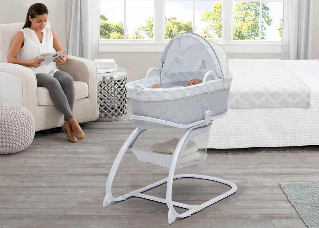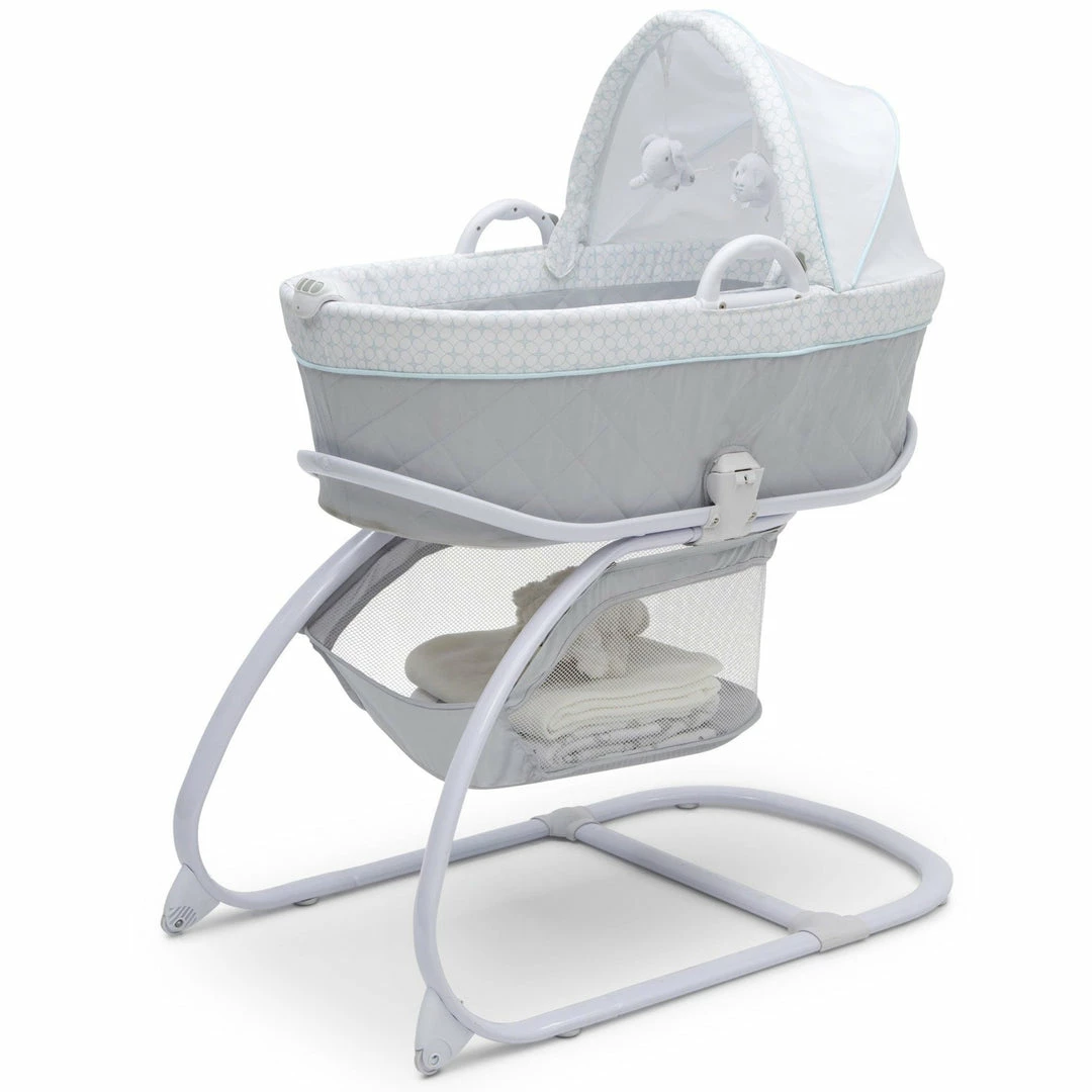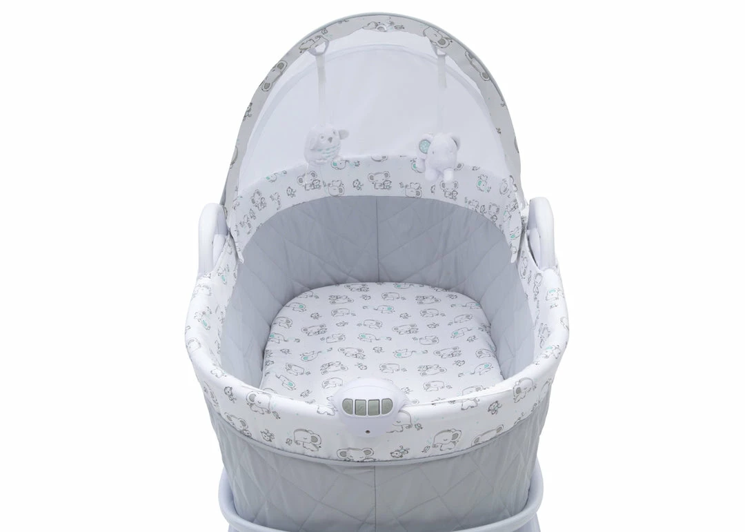 The Deluxe Moses Bassinet from Delta Children is a comfortable sleep space for newborns that combines a Moses basket with a standard bassinet. The adorable Moses basket safely attaches to the bassinet frame, and can be easily removed, so you can keep your baby nearby as you move around the house. To calm your newborn, the attached electronic pod plays peaceful music or emits gentle vibrations while two plush hanging toys attached to the canopy will stimulate Baby’s visual senses if they wake. A soft nightlight will help you check in on your little one without disturbing them, and an easy-to-reach storage basket keeps blankets, diapers or other supplies nearby. The bassinet’s adjustable canopy offers light blocking protection for daytime naps. A great first sleep space for your baby, the Deluxe Moses Bassinet from Delta Children is a versatile option that works in your bedroom, the living room, the kitchen, or anywhere else in the house you may go.