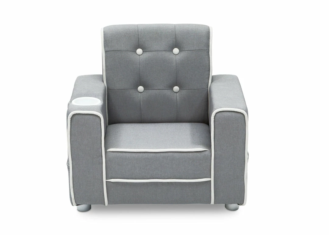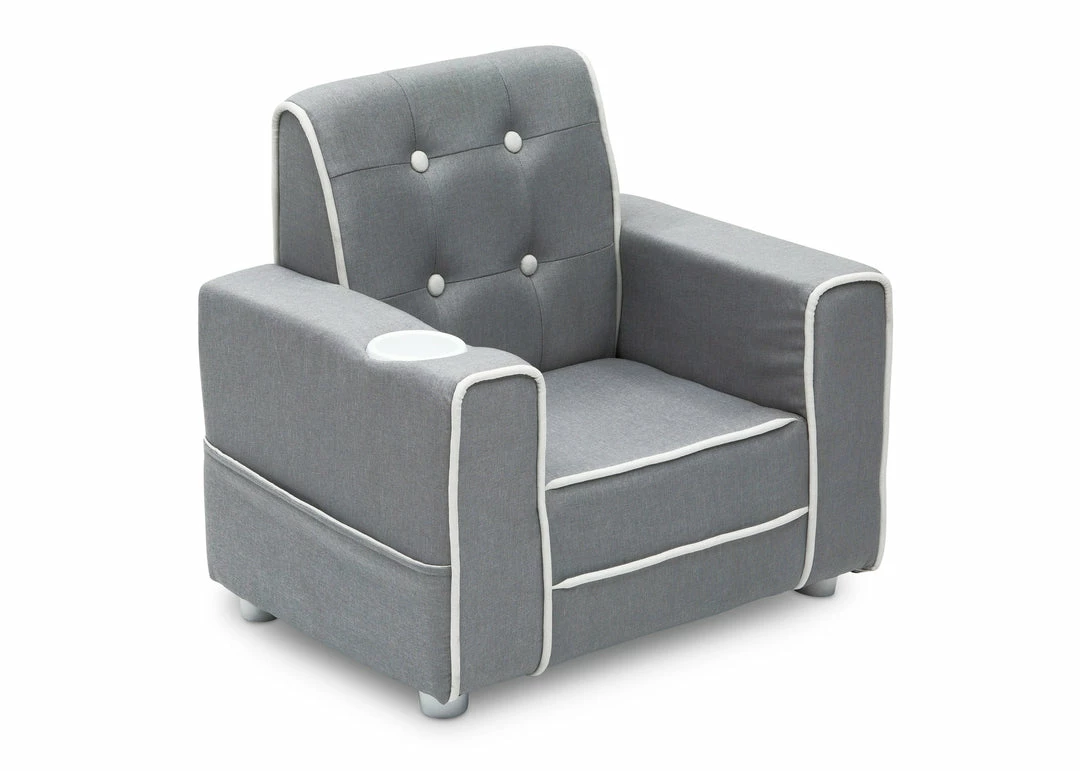 The Chelsea Kids Upholstered Chair with Cup Holder from Delta Children will give your little one a comfy place to read or relax. Button tufting on the back and contrasting piping adds grown-up style to this child-size chair while the built-in cup holder and storage pockets on the sides adds convenience. A chic addition to any children’s bedroom, playroom or the living room, this chair is crafted with a sturdy wood base and a generous foam fill to ensure it is as comfortable as it is stylish. Chair coordinates with other items in the Chelsea Collection from Delta Children.