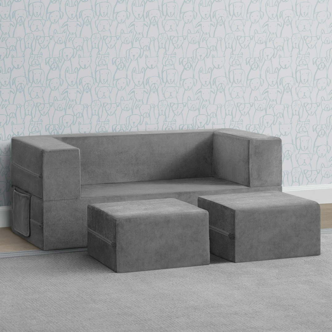 It’s a sofa! It’s a play mat! It’s a fort! The Convertible Foam Sofa and Play Set by Delta Children can be whatever your child imagines. The sofa’s convertible design with two included ottomans allows your little one to use it in so many ways. Use it as a sofa to watch TV, flip it open to use as a play mat or move the parts to configure a puppet theater, castle, ball pit or obstacle course. This modular play couch made up of three foam pieces will give kids hours of entertainment and encourage imaginative play while helping improve gross motor skills. The perfect addition to your child’s bedroom or playroom, the sofa’s sturdy foam base and plush slipcover with a storage pocket is a super-safe play structure. Slipcovers are removable and machine washable. Recommended for ages 18 months and up.