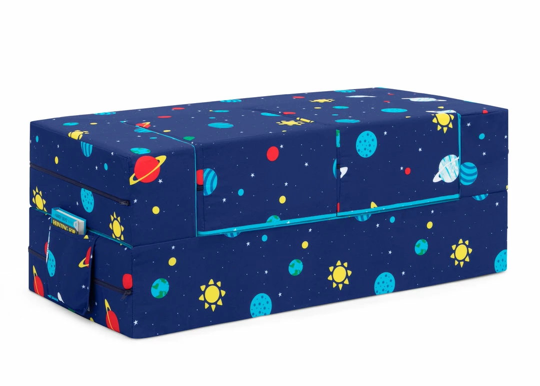 It’s a sofa! It’s a play mat! It’s a fort! The Convertible Foam Sofa and Play Set by Delta Children can be whatever your child imagines. The sofa’s convertible design with two included ottomans allows your little one to use it in so many ways. Use it as a sofa to watch TV, flip it open to use as a play mat or move the parts to configure a puppet theater, castle, ball pit or obstacle course. This modular play couch made up of three foam pieces will give kids hours of entertainment and encourage imaginative play while helping improve gross motor skills. The perfect addition to your child’s bedroom or playroom, the sofa’s sturdy foam base and soft slipcover with a storage pocket and printed with a super-cool outer space pattern is a super-safe play structure. Slipcovers are removable and machine washable. Recommended for ages 18 months and up.