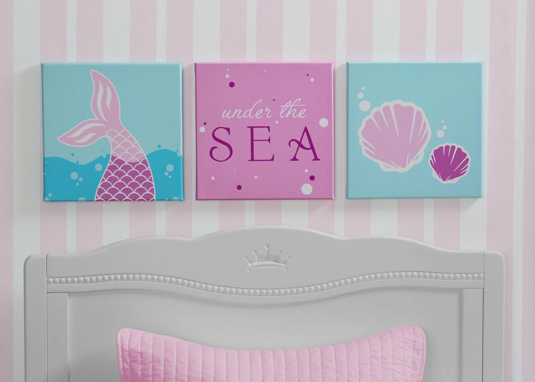 - MAKE A SPLASH: This wall art set features graphics of a mermaid tail, seashells and “Under the Sea” typography | Ideal for mermaid-themed nurseries or bedrooms | Coordinates with the Seashell Rug by Delta Children (sold separately)