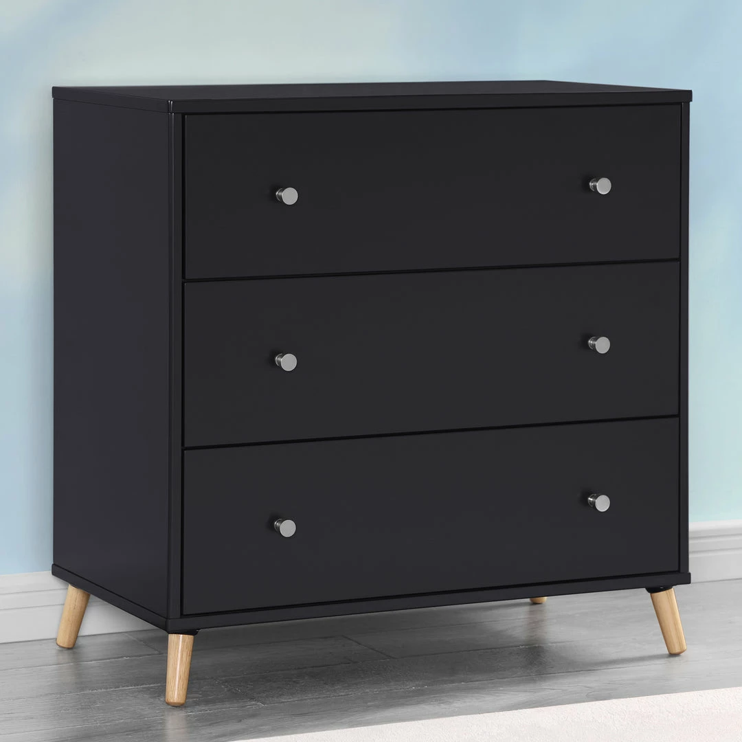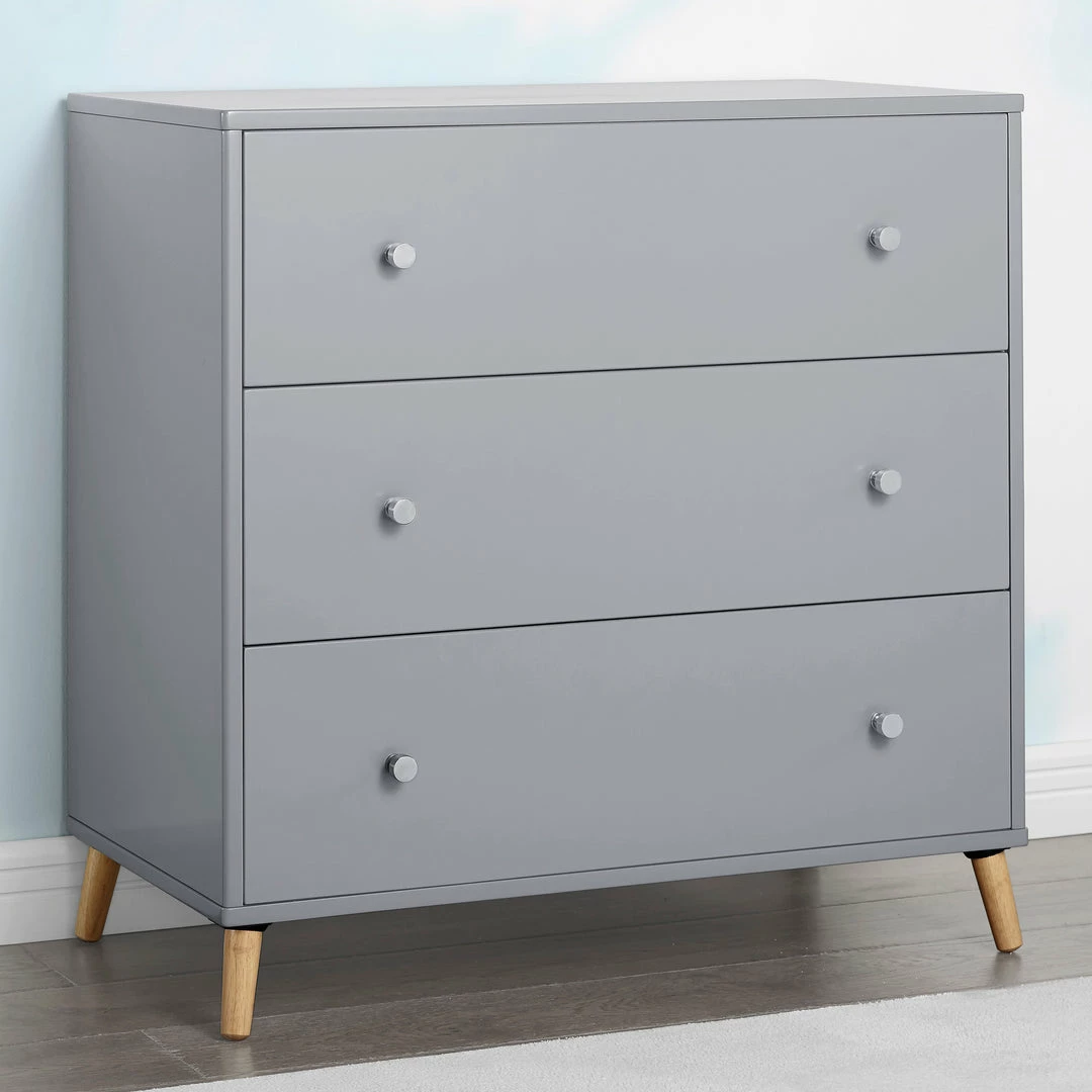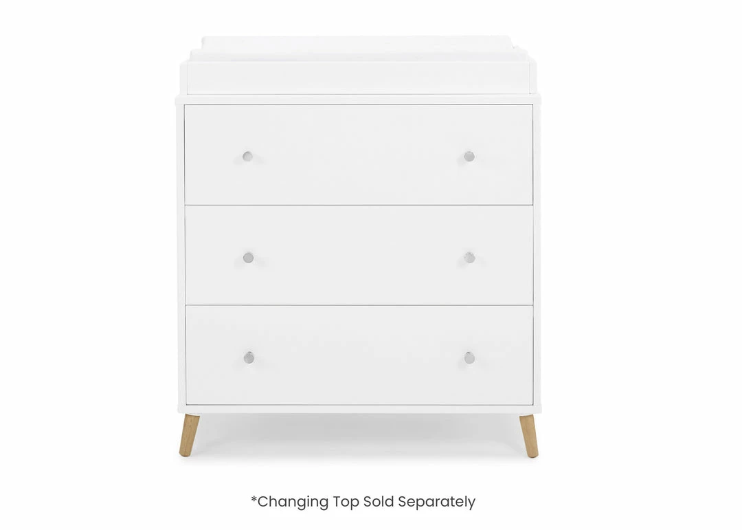 The Jordan 3 Drawer Dresser by Delta Children is a must-have storage unit for stylish parents and kids! Designed to elevate modern nurseries or bedrooms, it’s perfect accompaniment to your Jordan crib with its splayed feet and two-toned detailing. With three spacious drawers, this sturdy dresser provides a range of practical storage possibilities to suit all of your needs. Use it alone or attach the coordinating Changing Top #W100810 to create a secure and stylish changing table (Changing Top sold separately).