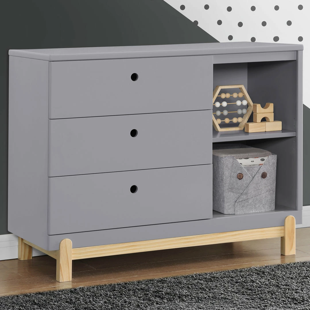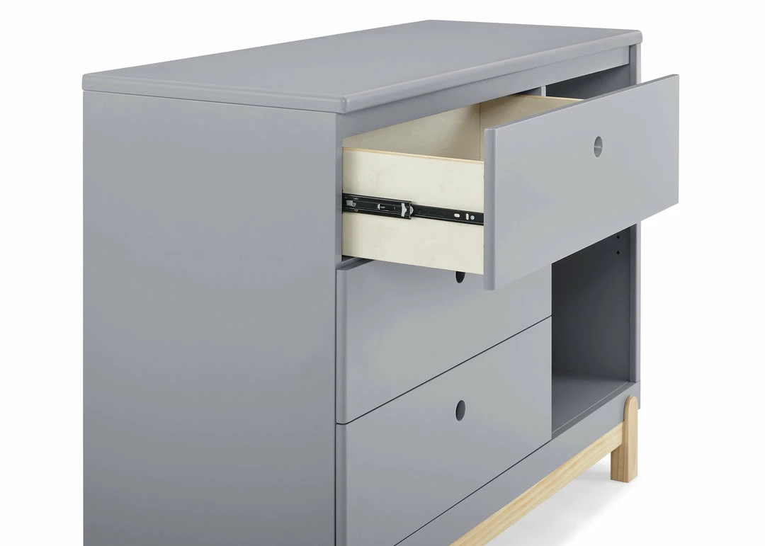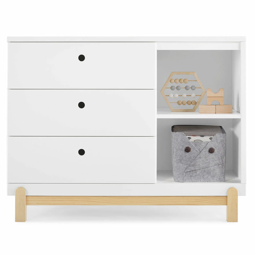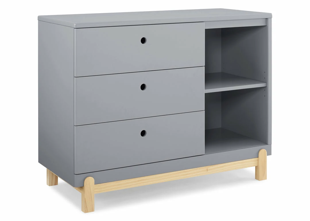 Bring style and convenient storage to your little one’s bedroom with the Poppy 3 Drawer Dresser with Cubbies by Delta Children. This wood dresser features three drawers to keep shirts, pants and socks, while the other side features two open cubbies to house books, bins or toys. Modern and playful, this versatile dresser features a natural wood base and feet paired with a contrasting finish on top for a look that works from baby to big-kid. To complete your child’s bedroom, pair the Poppy 3 Drawer Dresser with Cubbies with the Poppy 4-in-1 Convertible Crib by Delta Children. Dresser is available in Bianca White with Natural, Grey with Natural and Midnight Grey with Natural.