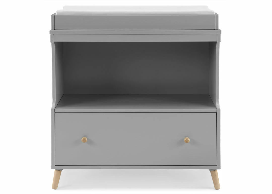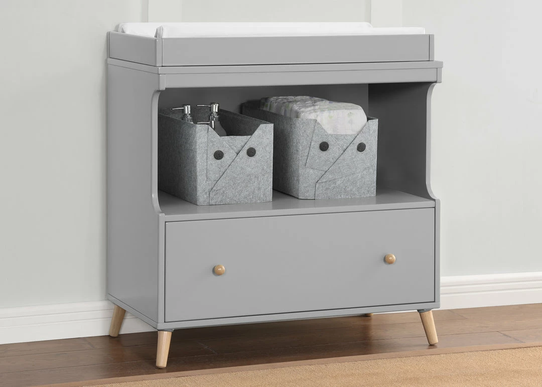 The Essex Convertible Changing Table with Drawer by Delta Children offers all the essentials—a secure place to change your baby, plus a drawer and open cubby for all of your storage needs. A new take on iconic mid-century style, it features simple lines and angled legs in a natural finish. This convertible changing table includes a topper that keeps the changing pad firmly in place (changing pad sold separately). Best of all, its innovative 2-in-1 design allows the changing topper to be easily removed once your child is potty-trained, effortlessly converting the piece into a standalone dresser. A great option that will grow with your child, from nursery to big-kid room, the Essex Changing Table with Drawer by Delta Children is also ideal for shared bedrooms, or anywhere you need a space-saving storage piece. Available in Grey or Bianca White, and coordinates with other items in the Delta Children Essex Collection.