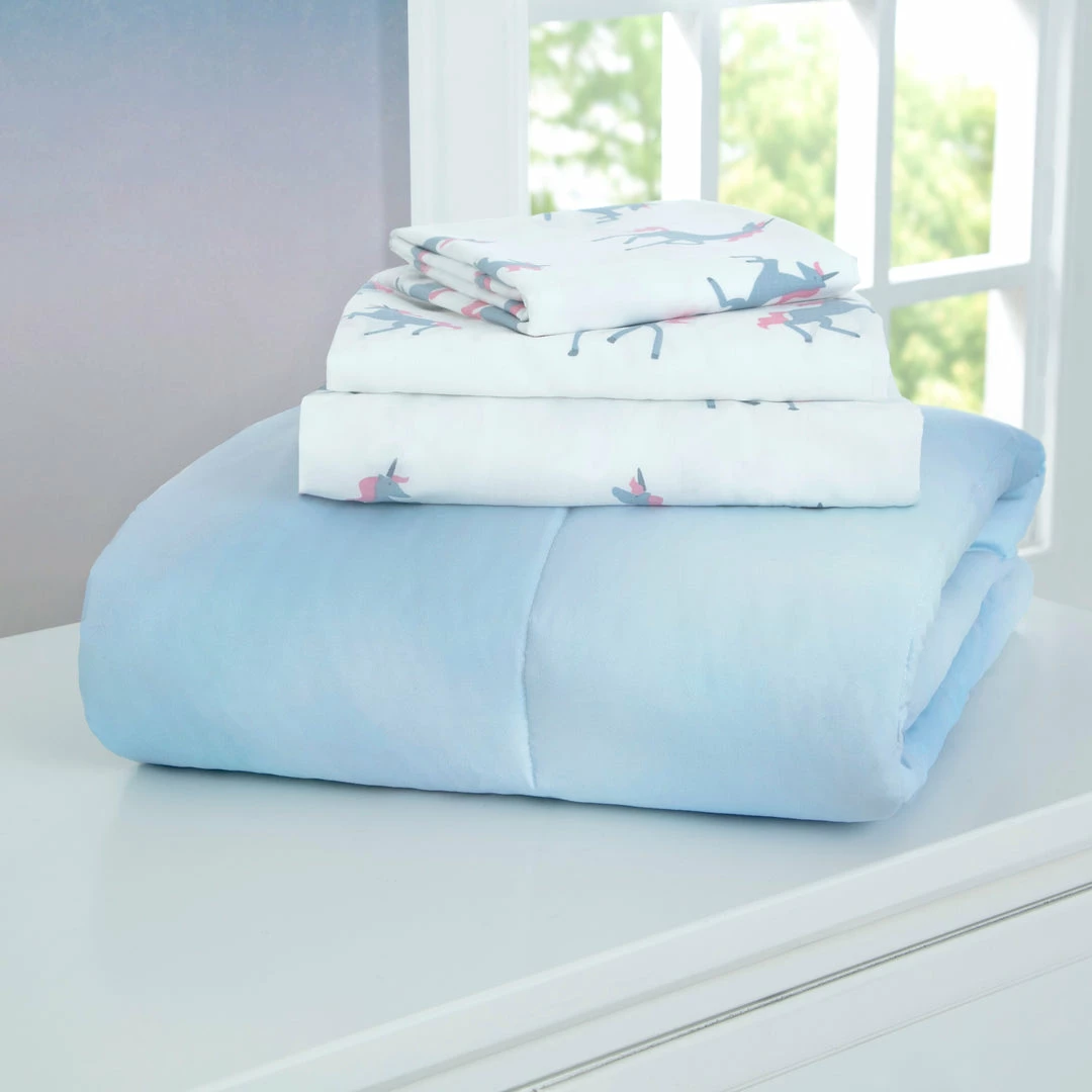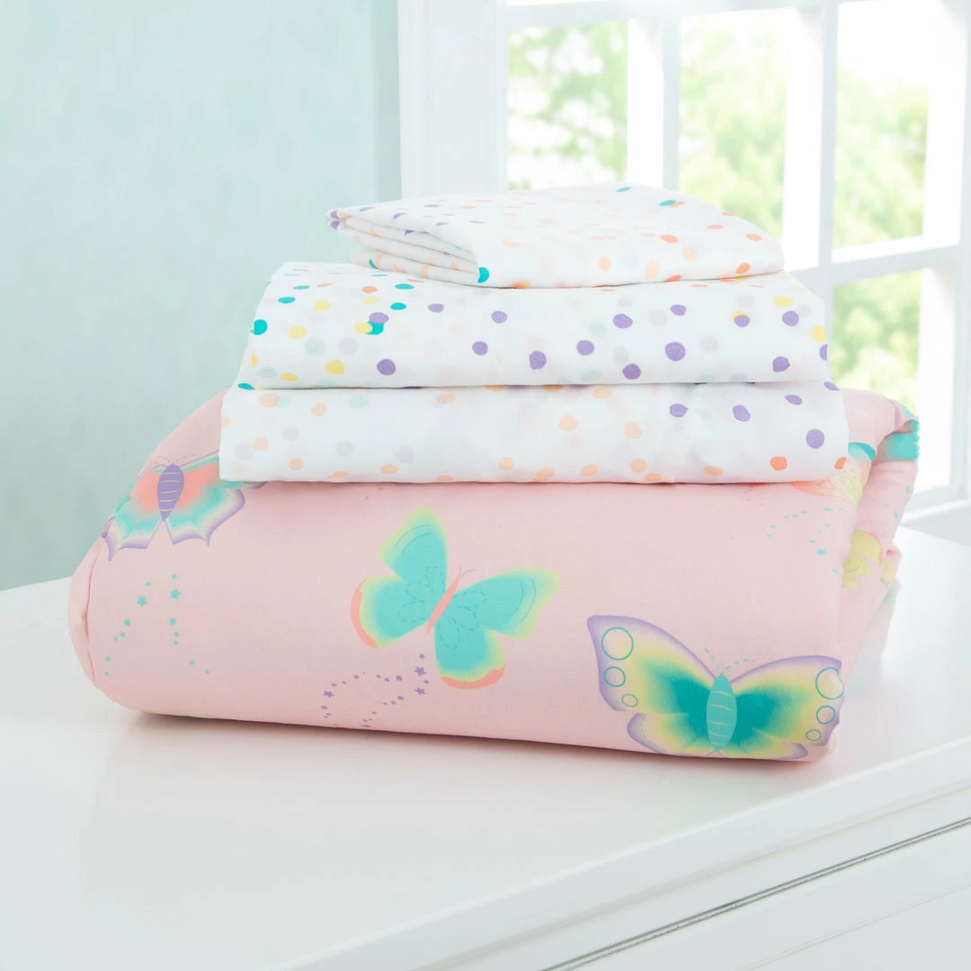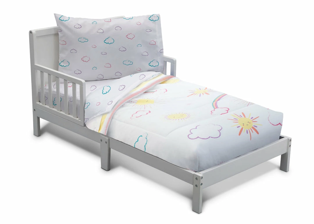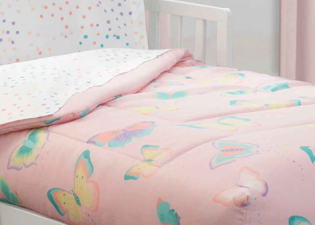 Create the best sleep space possible for your child with this 4-Piece Reversible Toddler Bedding Set by Delta Children. This girls’ toddler bedding set includes a fitted sheet, flat top sheet, standard size pillowcase, and a reversible comforter printed with an adorable pattern that kids will love. Constructed from a soft poly/cotton blend, these sheets will provide an oh-so-cozy “big kid bed” for your growing toddler. The set’s innovative top flat sheet and comforter have elastic bottoms to keep them in place, so it’s easy to keep your little one’s bedroom looking its best. Designed to fit a standard toddler size bed, with a 27” x 52″ mattress.