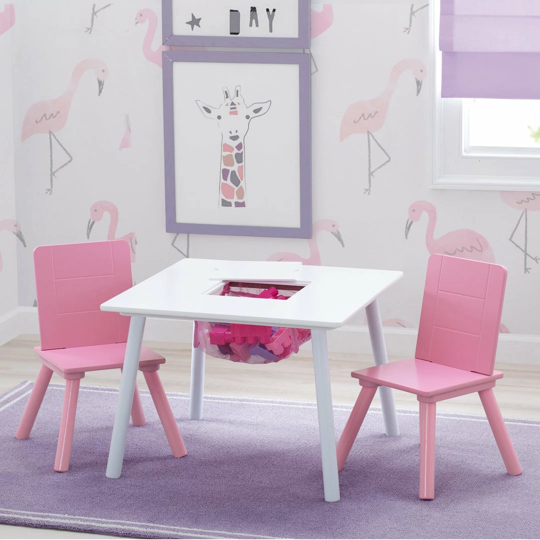 Spark years of creative play and learning with this Table and Chair Set with Storage by Delta Children. Perfectly sized for your growing child, this set features a sturdy wood table in white and two boldly colored chairs with grooved detailing. As functional as it is stylish, this set also features a built-in storage compartment at the center of the tabletop, perfect for stowing away toys, books or art supplies. Beautifully crafted, this set proves that play tables can be as tasteful, charming and multi-functional as the rest of your home décor—use it in your child’s bedroom, playroom or any living space.