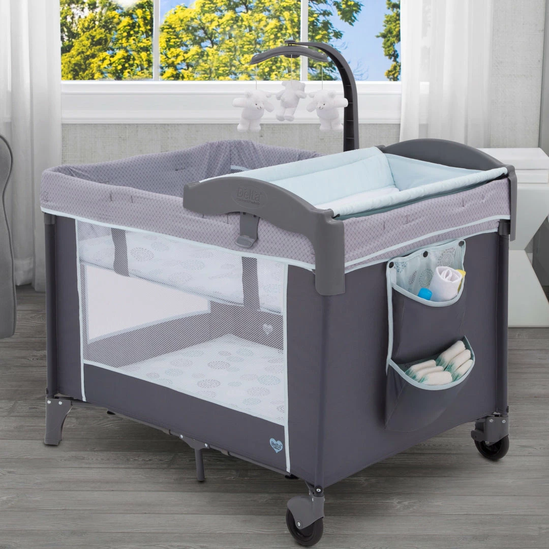 Keep your baby safe, close and comfy with the LX Deluxe Play Yard from Delta Children. You’ll love all the convenient features-the removable bassinet provides the ideal spot for naptime or bedtime, and the removable changing table means you’ll always have a sturdy place to change diapers or dress your baby. The detachable storage compartment keeps changing necessities nearby, so you never have to run to another room for diapers or wipes. When your baby outgrows the bassinet, the insert is removable and the LX Deluxe Play Yard functions like a full size playard. Large mesh sides provide optimal ventilation while also permitting a clear view. Designed to use at home or away, the play yard’s wheels make it super-easy to move around the house, and the quick fold construction and included carry bag make for fuss-free travel. The LX Deluxe Play Yard from Delta Children features everything needed for a nursery in a portable design.