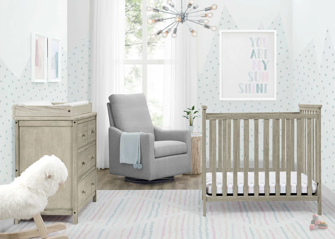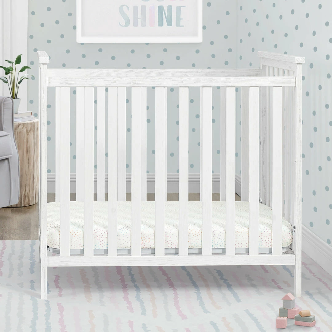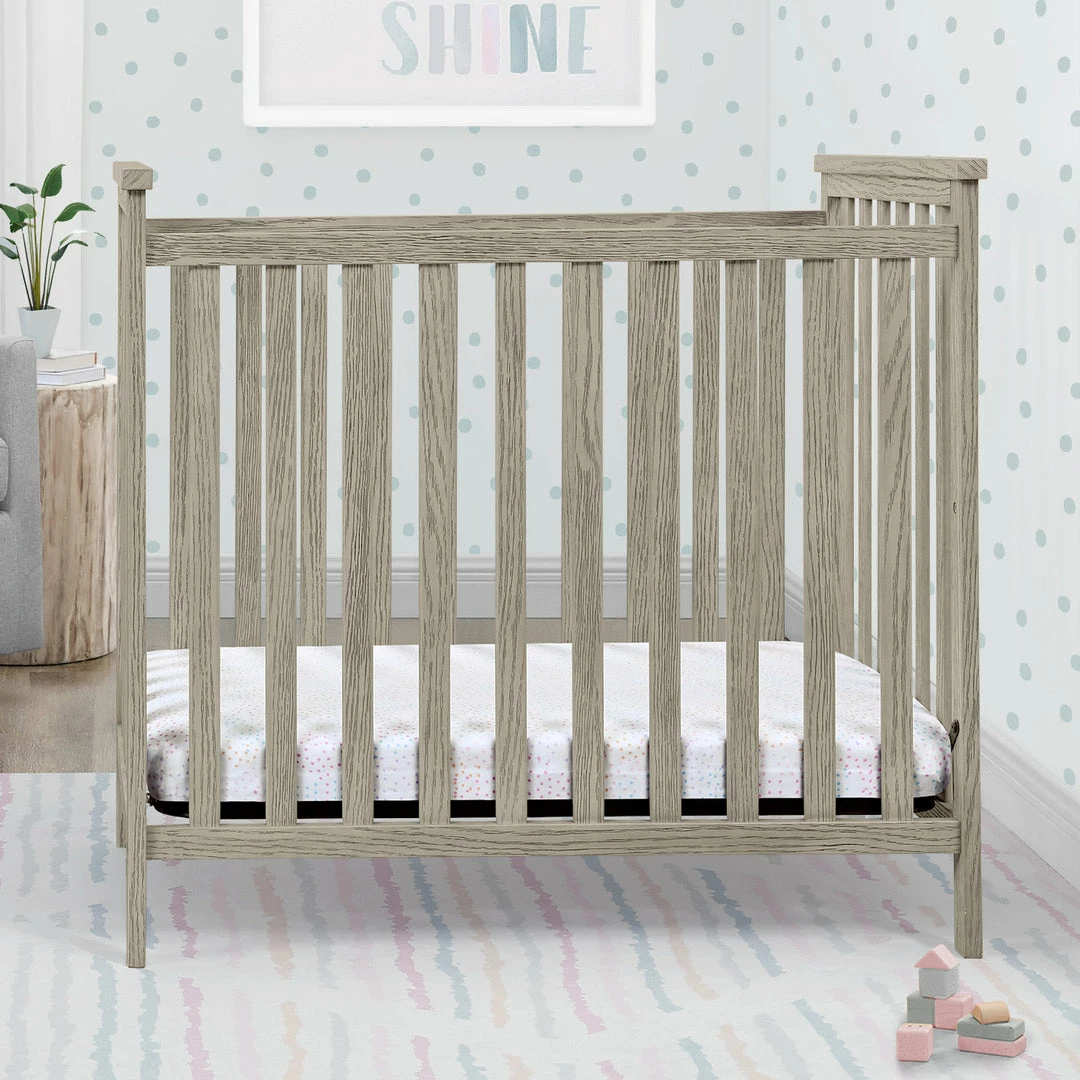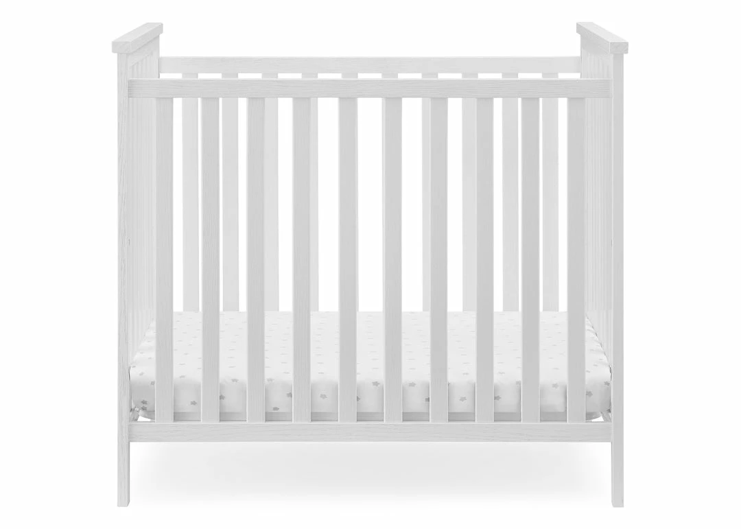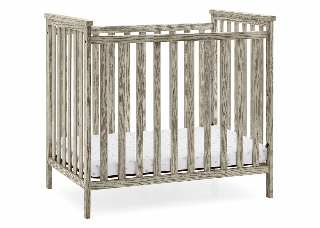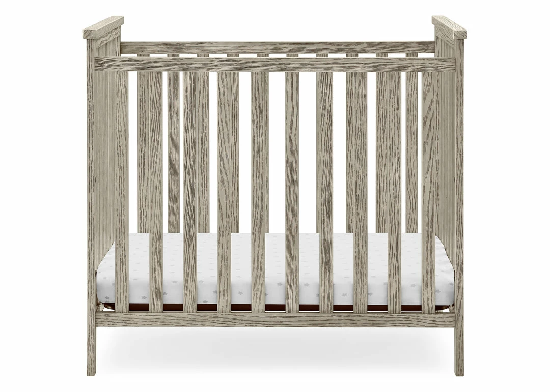 The Delta Children Middleton Mini Crib with 2.75-Inch Mattress features a textured finish for a farmhouse-inspired design created especially for small spaces. Two adjustable mattress positions allow you to lower the mattress height as baby grows, ensuring maximum use, while the included water-resistant crib mattress provides a comfy and easy-to-clean sleep space. A great option for your baby’s bedroom, this rustic mini crib offers a charming style that will work in any nursery. Available in Textured Limestone and Textured White. Complete your baby’s nursery with coordinating items in the Delta Children Middleton Collection.