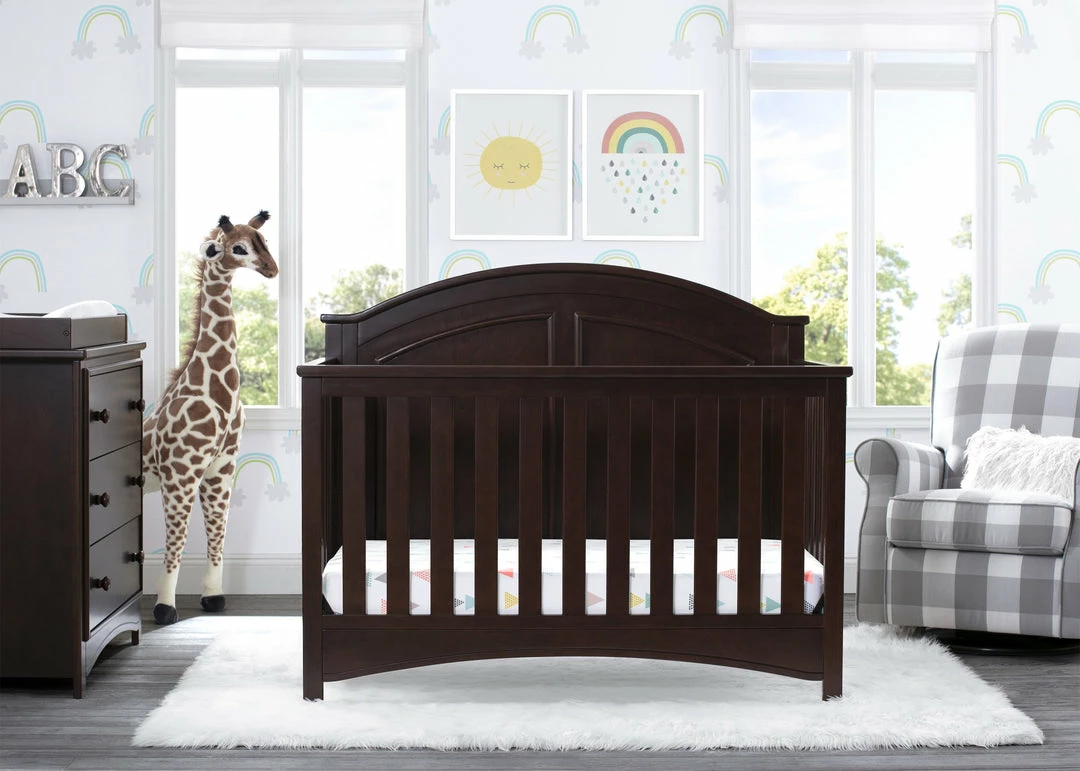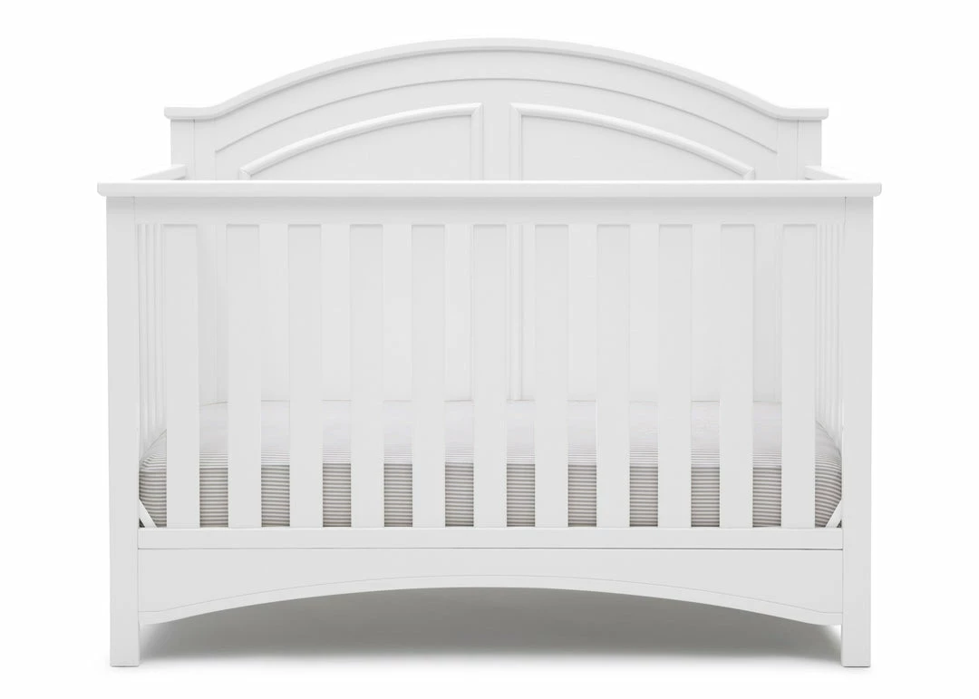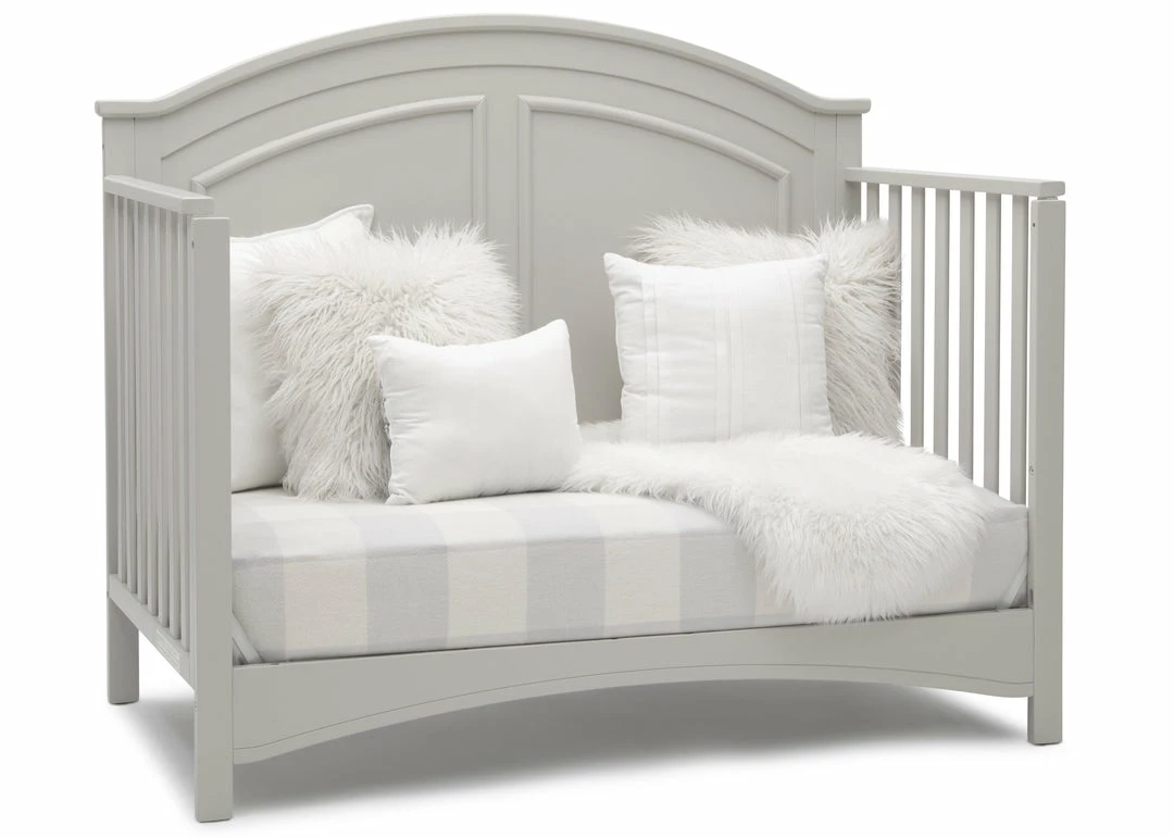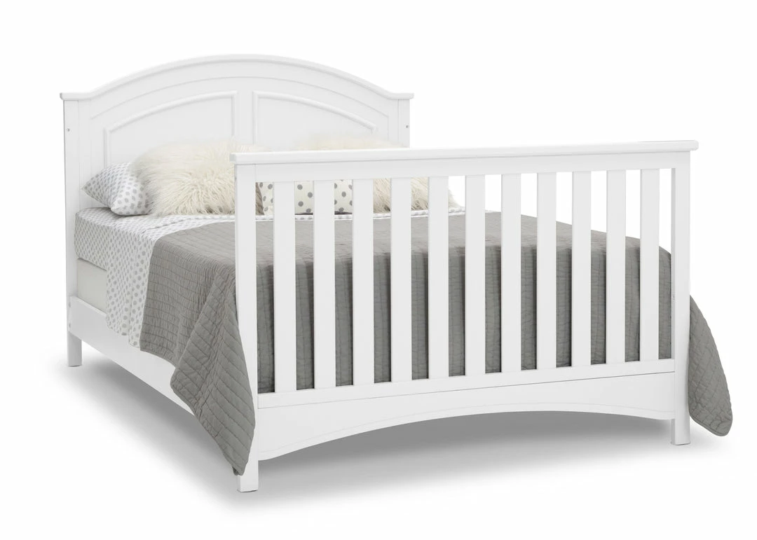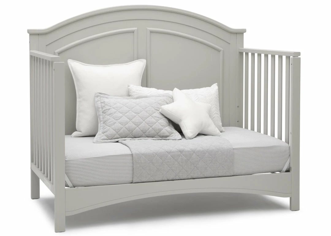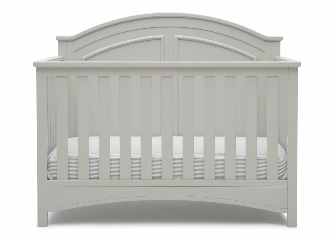 Subtle curves, crown molding and a graceful arch make the Perry 6-in-1 Convertible Crib by Delta Children quietly sophisticated (and quiet is just what you want in a nursery!). Designed to grow with your baby, it features an adjustable three-position mattress platform that keeps baby safe at all stages—lower it as your baby begins to sit or stand. Plus, it converts from a crib into a toddler bed, daybed, sofa, full size bed with headboard only and full size bed with headboard and footboard—it’s the only bed your child will ever need! Available in Bianca White, Moonstruck Grey and Walnut Espresso. Complete your baby’s nursery with coordinating items in the Delta Children Perry Collection.