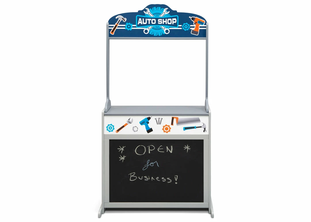 Ideal for your little fire fighter, first responder or farmer, the Reversible 4-in-1 Pretend Play Center by Delta Children features four interchangeable storefronts for endless imaginative play. The included storefront panels are printed in fun themes, so kids can pretend they are at the farmers’ market, firehouse, auto body shop or first aid station. Imaginative play helps your child’s development by building on their language skills, social and emotional growth and well as their problem-solving skills. On one side of the play center, a large chalkboard allows kids to draw while the other side features six plastic storage bins for plenty of storage. Above the chalkboard and storage bins there is space to decorate with the included reusable vinyl stickers that match the storefront themes.