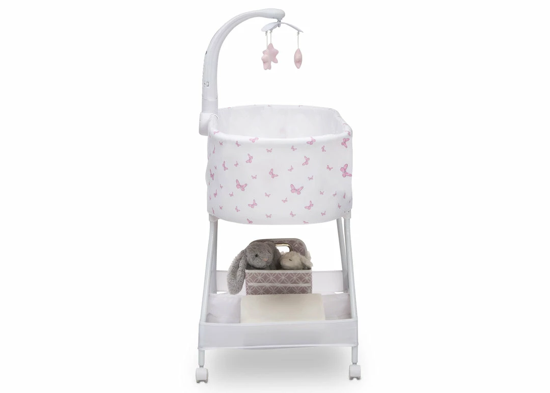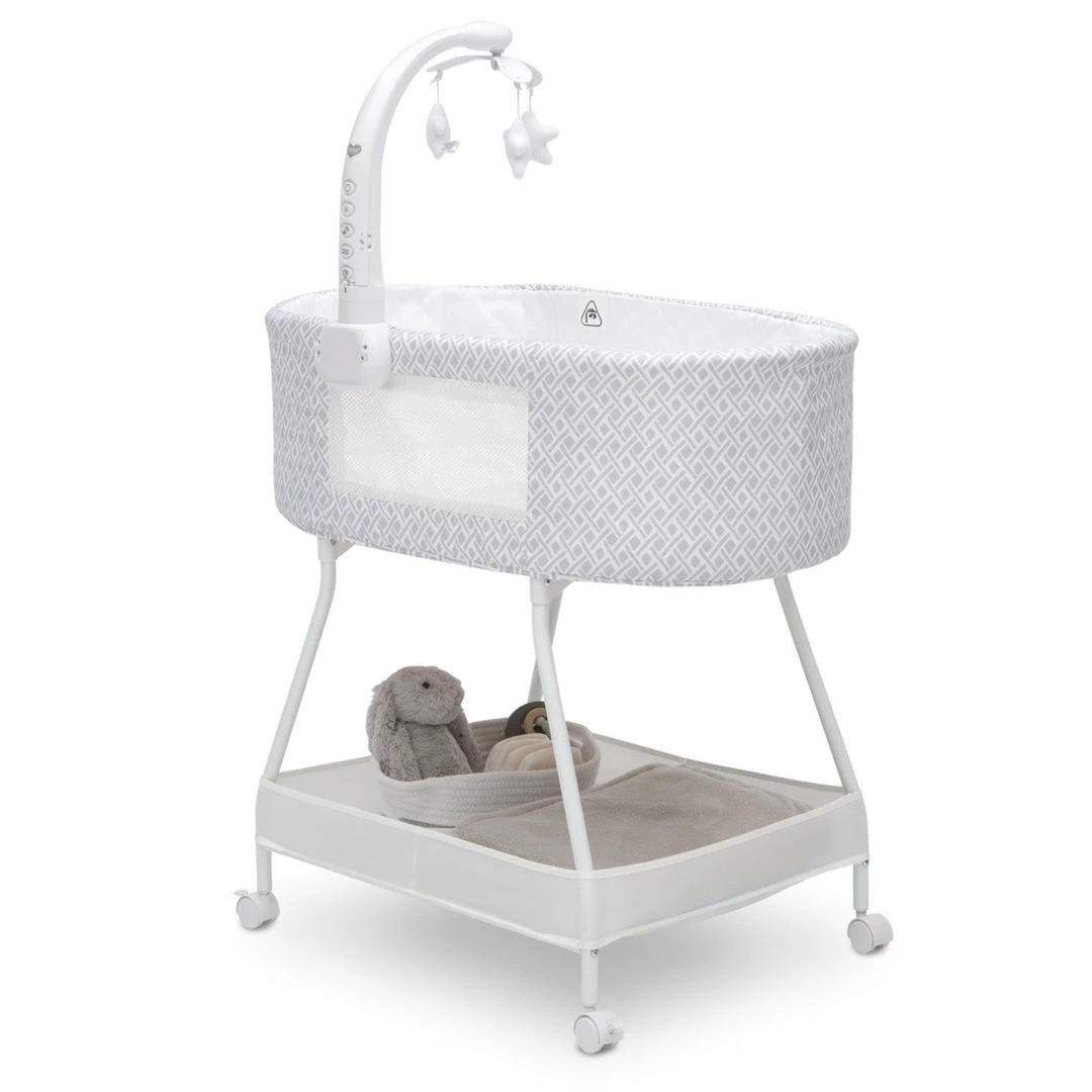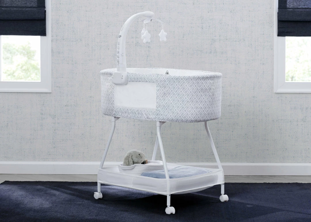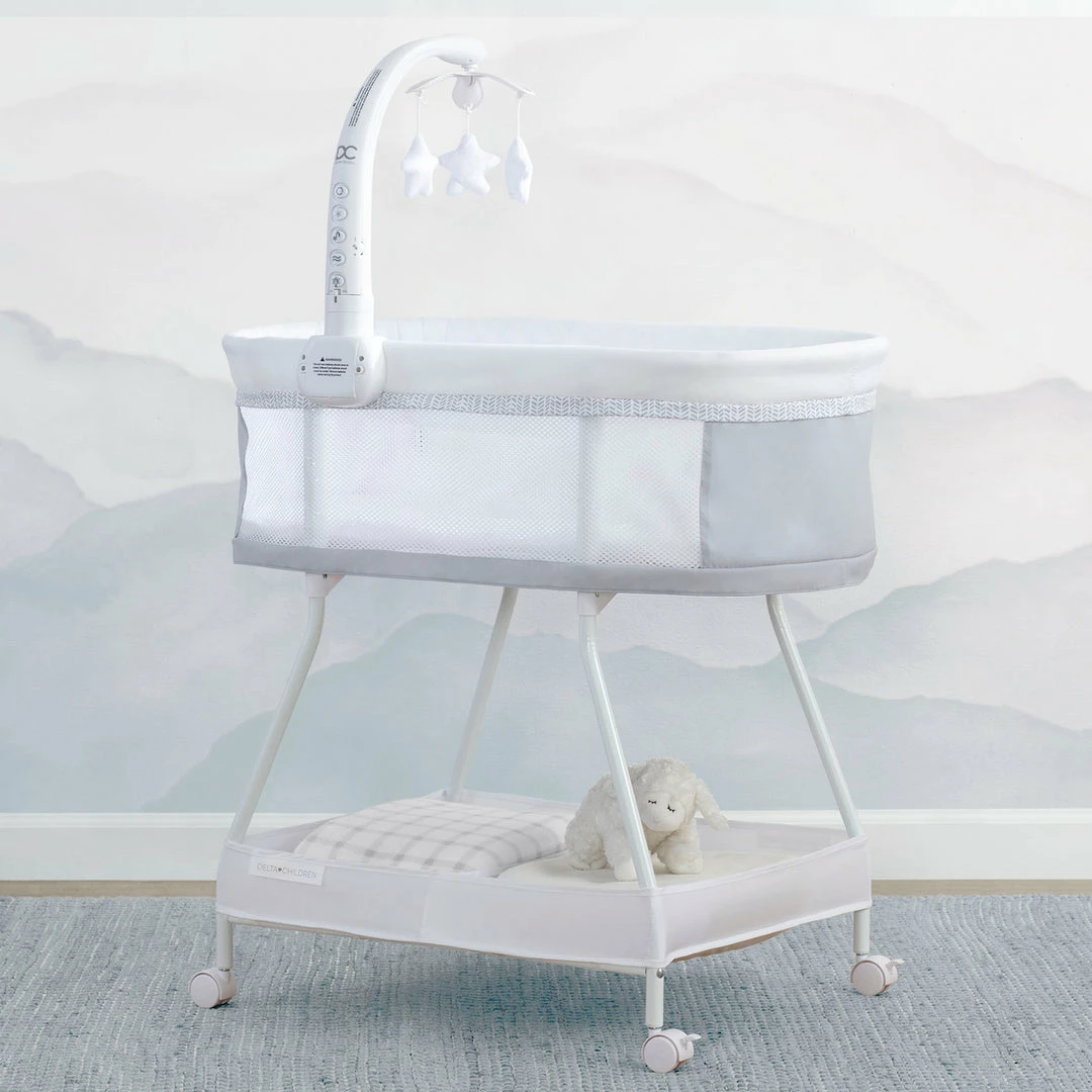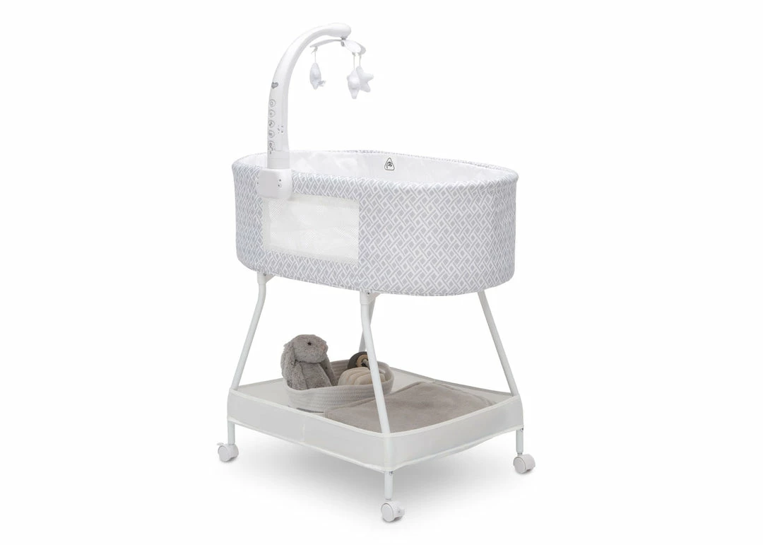 Help your baby sleep better with the Sweet Slumber Bassinet by Delta Children! The attached electronic mobile features spin toys, a soft-glow nightlight, soothing sounds, vibrations, and twinkle lights–everything you and your newborn need. A breathable mesh window on the side increases airflow and provides a clear view of your sleeping baby. Use it anywhere in the house you need a cozy, safe sleep space for your little one, including your bedroom or living room, its wheels make it easy to move from room to room. A generously sized storage basket underneath the frame makes it easy to access all of your baby essentials, and the removable fitted sheet is machine washable for easy care. This bassinet is recommended for babies 0-5 months. Stop use at 5 months or once your infant begins to push up on their hands and knees, whichever comes first.