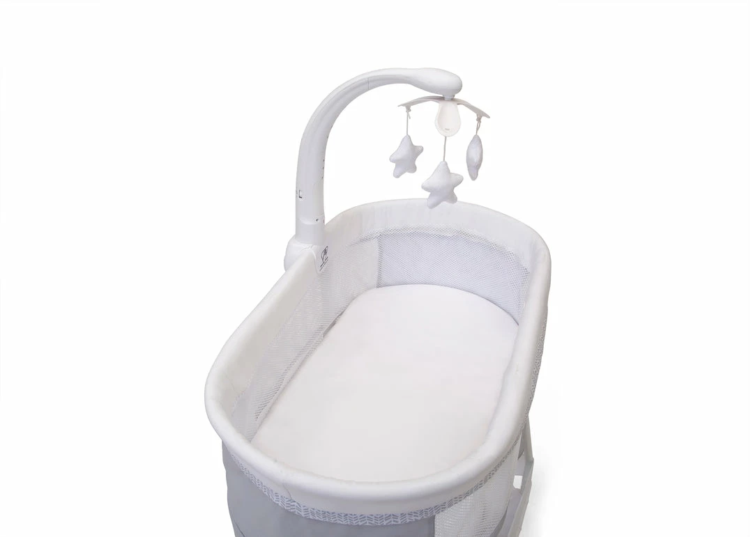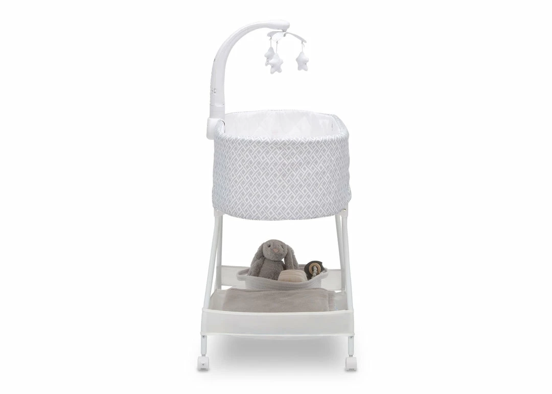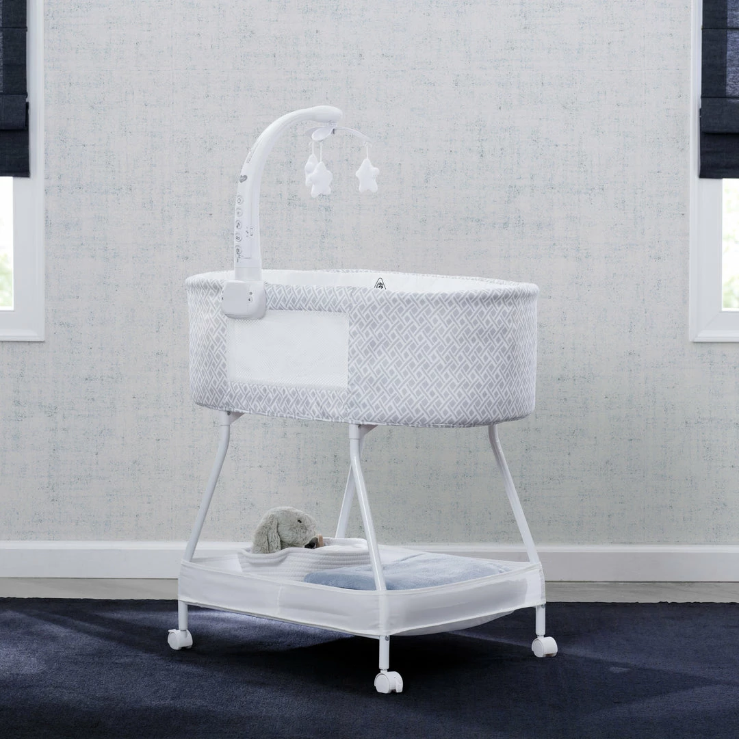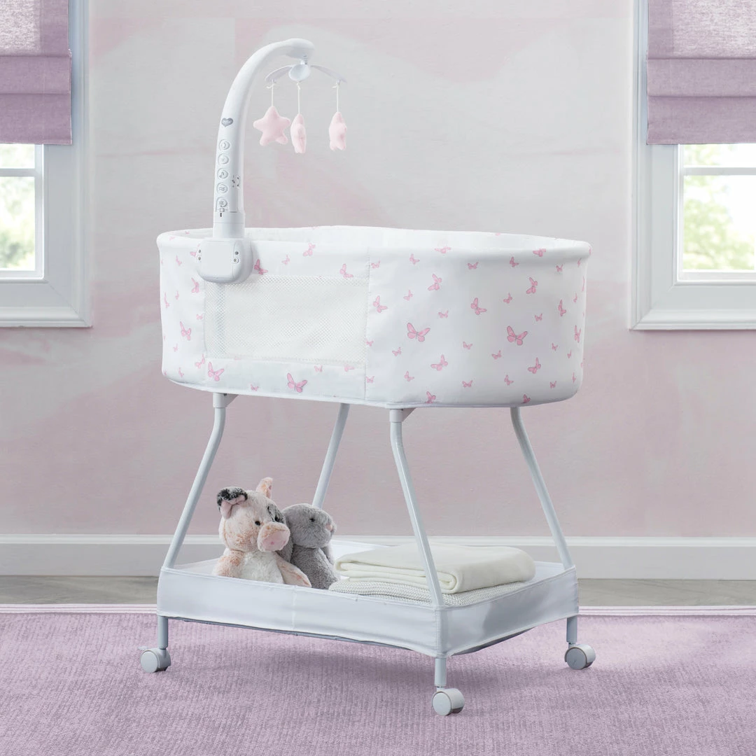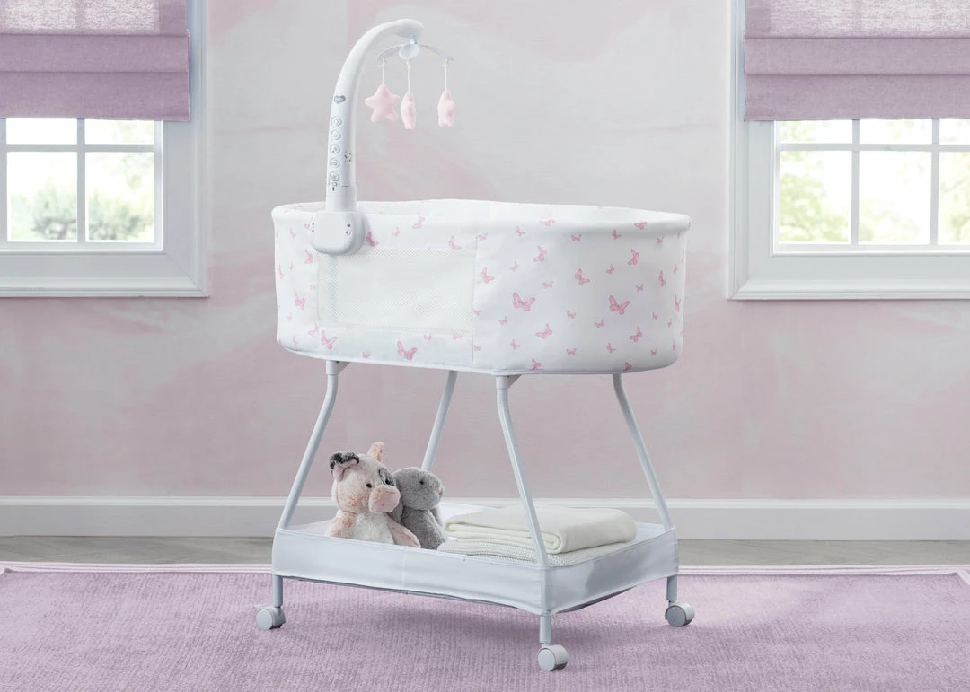 Help your baby sleep better with the Sweet Slumber Bassinet by Delta Children! The attached electronic mobile features spin toys, a soft-glow nightlight, soothing sounds, vibrations, and twinkle lights–everything you and your newborn need. A breathable mesh window on the side increases airflow and provides a clear view of your sleeping baby. Use it anywhere in the house you need a cozy, safe sleep space for your little one, including your bedroom or living room, its wheels make it easy to move from room to room. A generously sized storage basket underneath the frame makes it easy to access all of your baby essentials, and the removable fitted sheet is machine washable for easy care. This bassinet is recommended for babies 0-5 months. Stop use at 5 months or once your infant begins to push up on their hands and knees, whichever comes first.