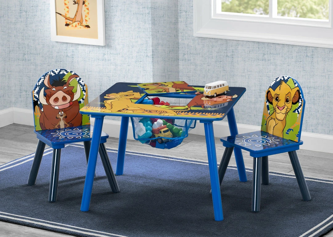 The Lion King Table and Chair Set with Storage by Delta Children is built for a roaring good time! Featuring full color character art of Simba, Timon and Pumbaa, this set includes a table and two chairs, designed at the perfect kid-sized height, making it ideal for snack time, playtime or homework. Plus, a built-in storage compartment at the center of the table provides the perfect space to keep art supplies and toys.