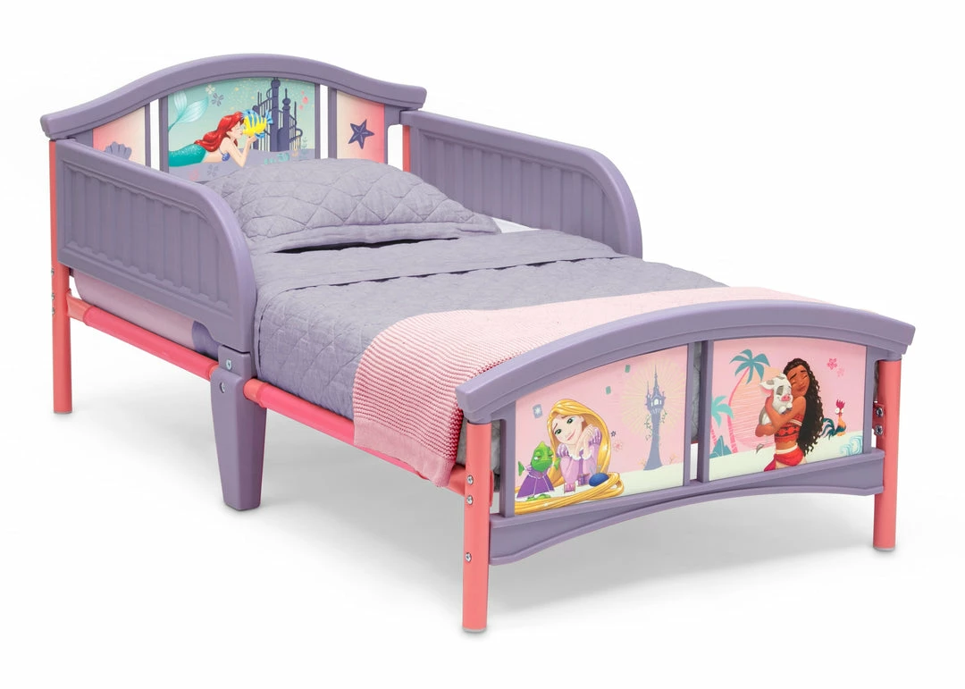 Your little one will relax like royalty with this Disney Princess Plastic Toddler Bed by Delta Children. Featuring colorful decals of everyone’s favorite Disney princesses, Ariel, Rapunzel and Moana, this kids’ toddler bed ensures each night ends happily ever after. The bed’s low mattress height and attached guardrails make it the best option for your child’s first big-kid bed, giving them the independence they crave while keeping them safe throughout the night. Get this toddler bed today and bring home the magic of Disney! Bedding and mattress not included.