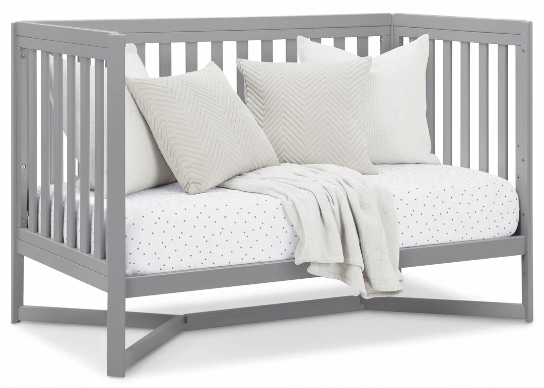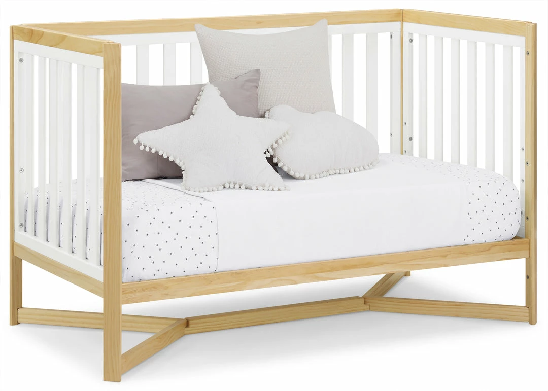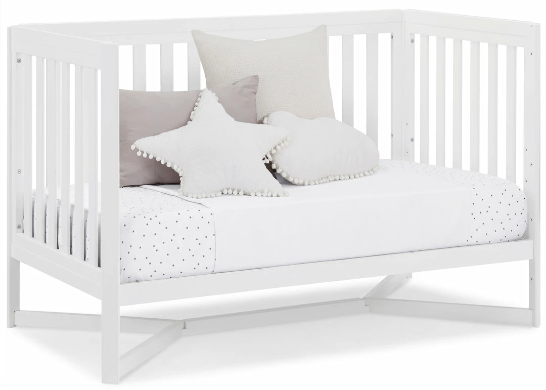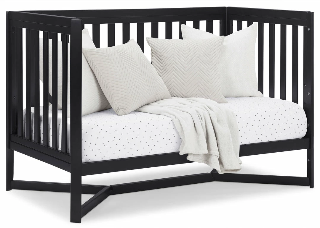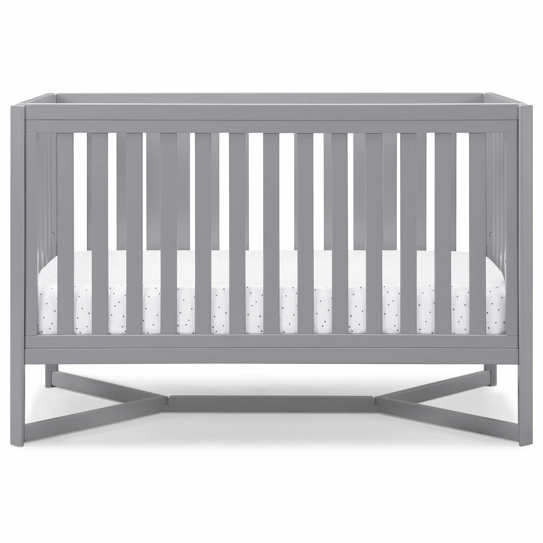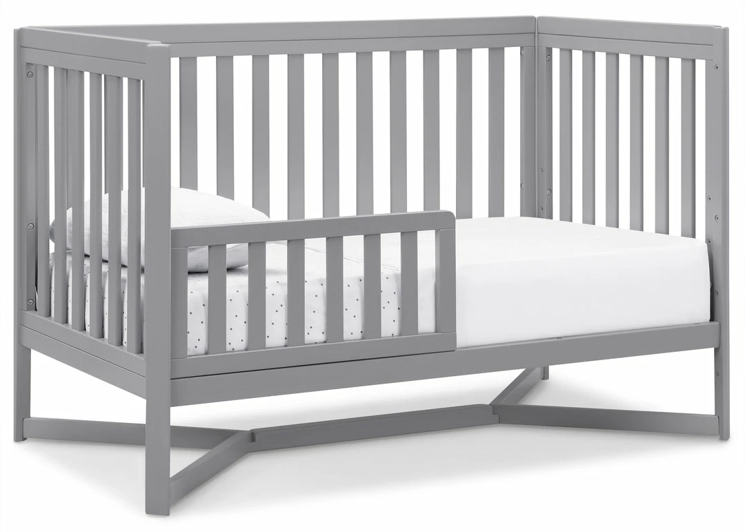 Designed to be the centerpiece of your nursery, the Tribeca 4-in-1 Convertible Crib by Delta Children exudes contemporary cool. Featuring plenty of modern touches it boasts a sleek x-shaped base and airy slats. Crafted from strong and sturdy wood, this crib features three height levels, and converts to a toddler bed, daybed and full size bed, making it the only bed your baby will every need. Toddler Guardrail #0080, Full Size Wood Bed Rails #0050 or Full Size Metal Bed Frame #0040 sold separately.