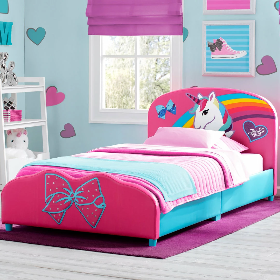 Encourage her to dream crazy big with the Nickelodeon JoJo Siwa Upholstered Twin Bed by Delta Children. The ultimate retreat for the JoJo Siwa fan, this twin bed bursts with character, and girlish charm, boasting enchanting graphics of a unicorn and rainbow on the headboard, while the footboard features 3D applique detailing of JoJo’s signature bow. A heart-shaped, JoJo Siwa logo and pink tones all over further channel the bubbly spirit of your child’s favorite dance star. Fully upholstered in faux leather with a sturdy and durable hardwood frame, this kids’ bed creates a cozy, magical and safe sleep space for the little superstar in your life. It’s a super-cool place where she can nap, sleep or catch up on her favorite show, The JoJo & BowBow Show Show.