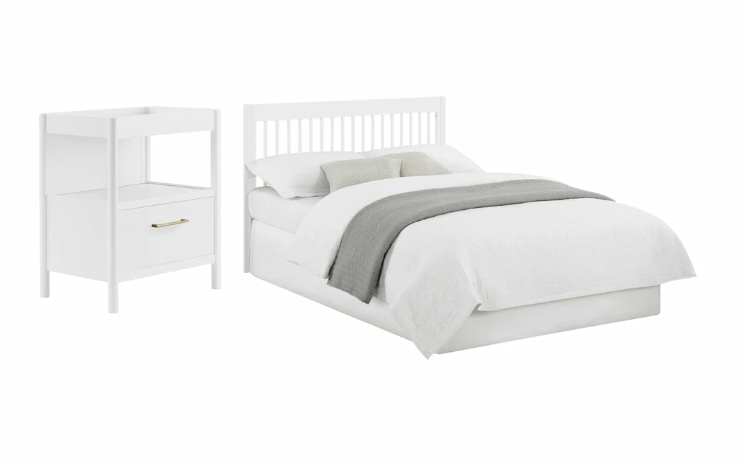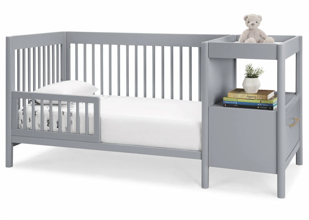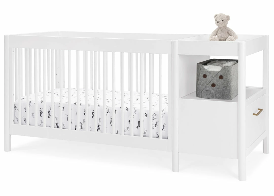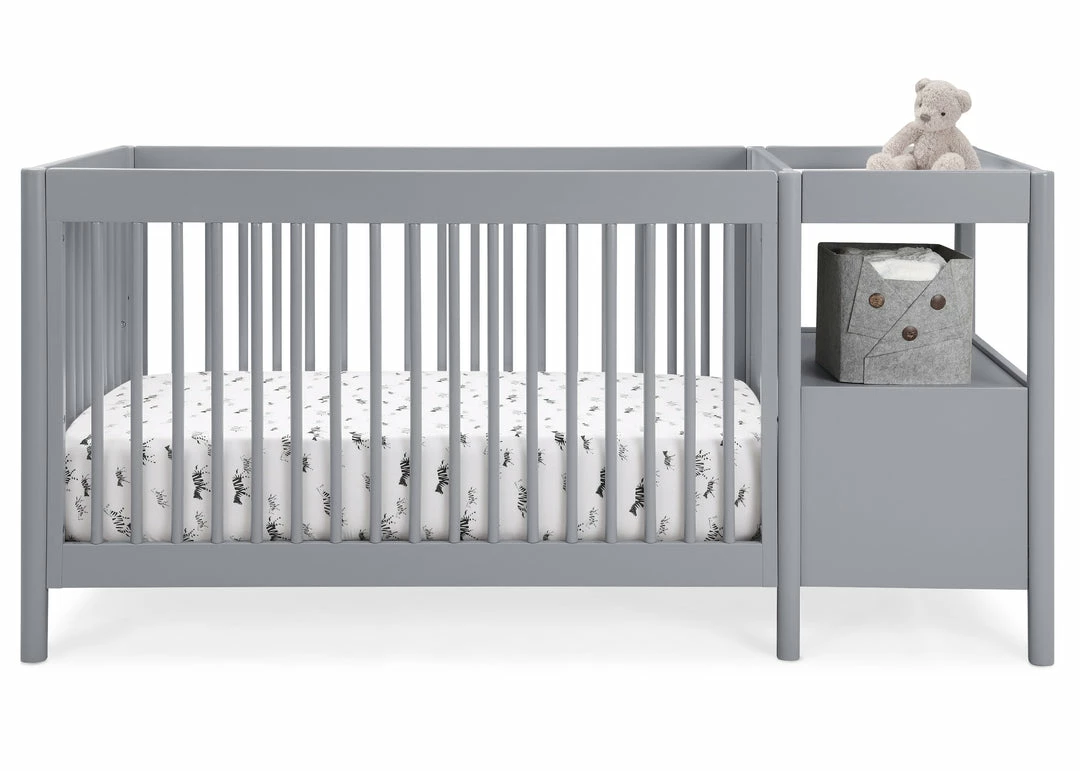 The Zoe 5-in-1 Convertible Crib and Changer by Delta Children is perfect for small nurseries. The crib’s attached changing table, drawer and open storage shelf will help busy parents stay organized and keep essentials within reach. Plus, its versatile design gives you the option to attach the changing table on the left or right side of the crib, and it can be used as a standalone side table when the crib is converted into a full size bed. This multifunctional crib saves precious square footage and looks good while doing it, the round spindles and brushed brass drawer pull add a modern touch. Built to accommodate your baby from birth through their teenage years, this crib features three adjustable height levels that can be lowered as your child begins to stand, and it converts from a crib to a toddler bed, sofa, daybed and full size bed. It’s everything you need for your nursery in one beautiful piece. Available in Bianca White and Grey. Daybed/Sofa Rail and Changing Pad included; Toddler Guardrail #W100725 and Full Size Bed Frame sold separately.