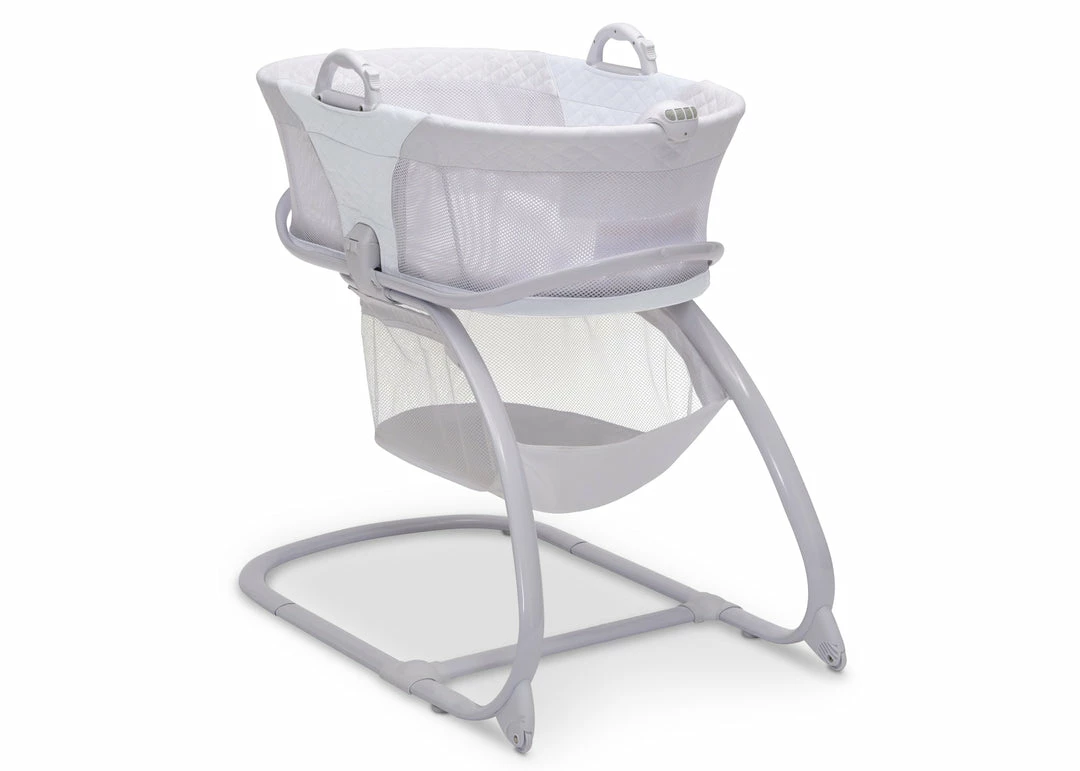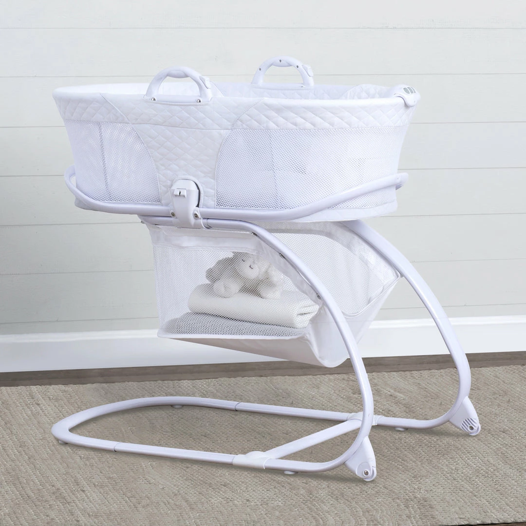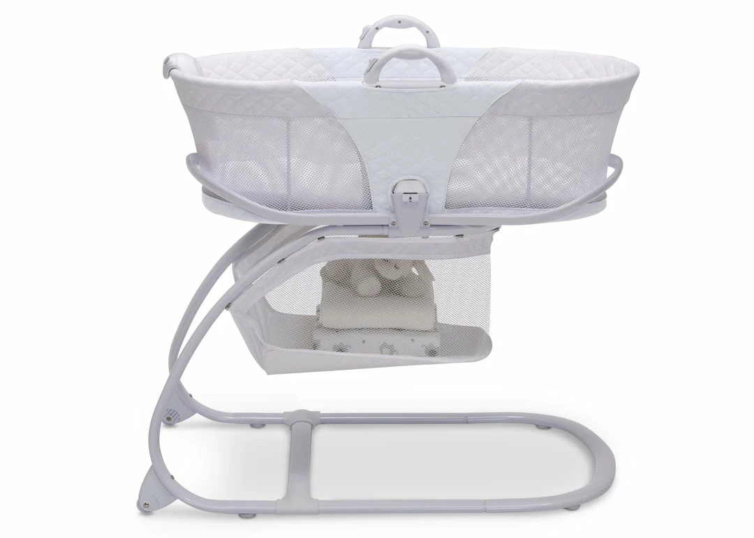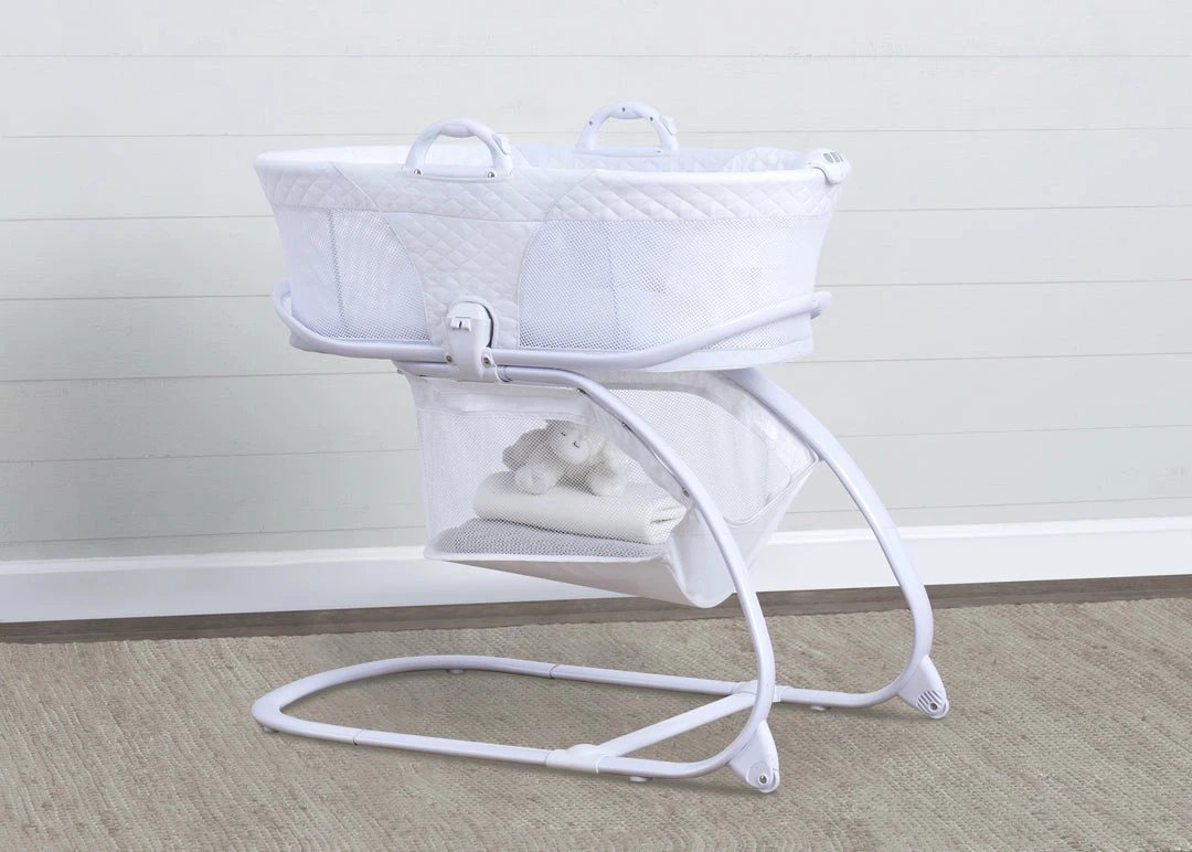 The Little Folks 2-in-1 Moses Basket Bedside Bassinet Sleeper by Delta Children is a comfortable sleep space for newborns that combines a Moses basket with a standard bassinet. The adorable Moses basket safely attaches to the bassinet frame, and can be easily removed, so you can keep your baby nearby as you move around the house. To calm your newborn, the attached electronic pod plays peaceful music or sounds, emits gentle vibrations and features a soft-glow nightlight. An easy-to-reach storage basket keeps blankets, diapers or other supplies nearby. A great first sleep space for your baby, the Little Folks 2-in-1 Moses Basket Bedside Bassinet Sleeper by Delta Children is a versatile option that works in your bedroom, the living room, the kitchen, or anywhere else in the house you may go. This bassinet is recommended for babies 0-5 months. Max weight 30 lbs. Stop use at 5 months or once your infant begins to push up on their hands and knees, whichever comes first.