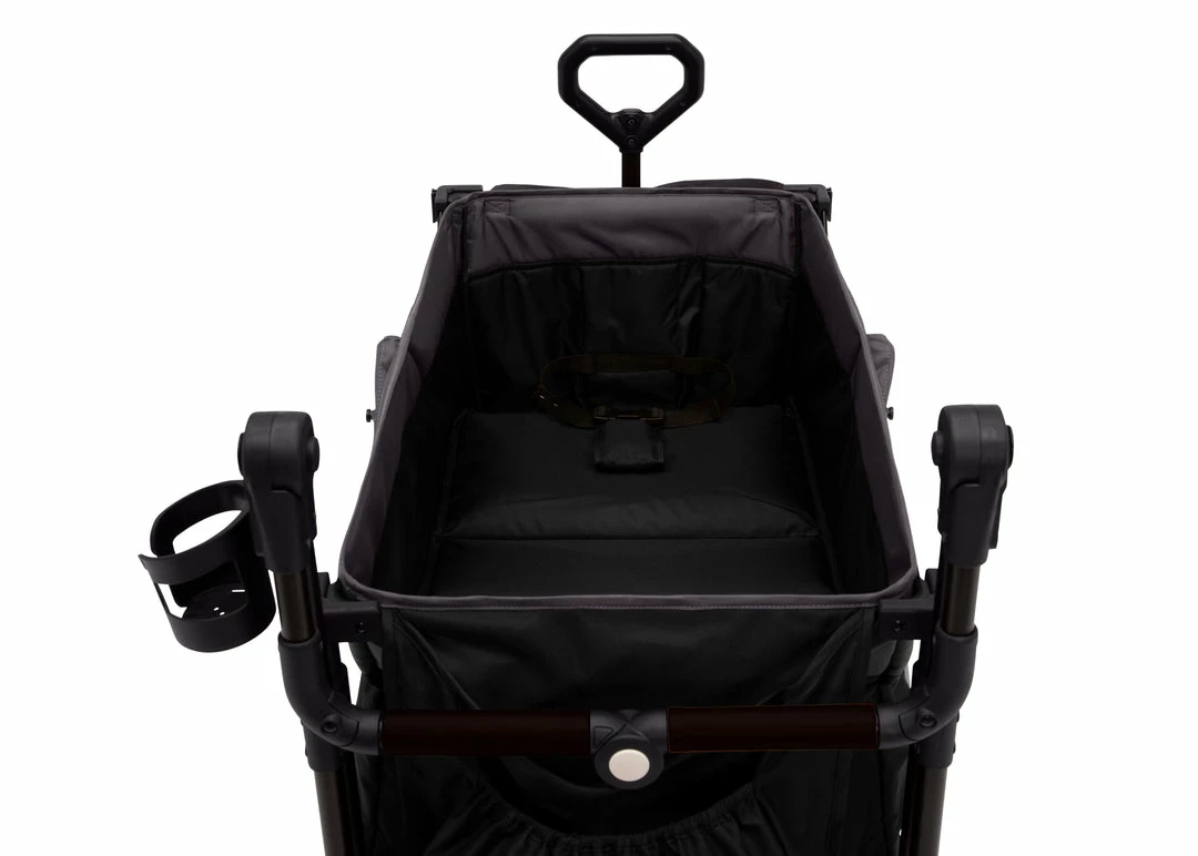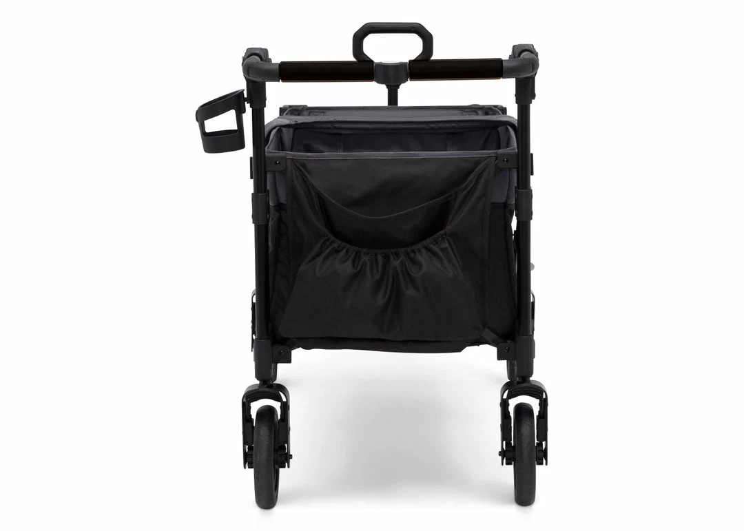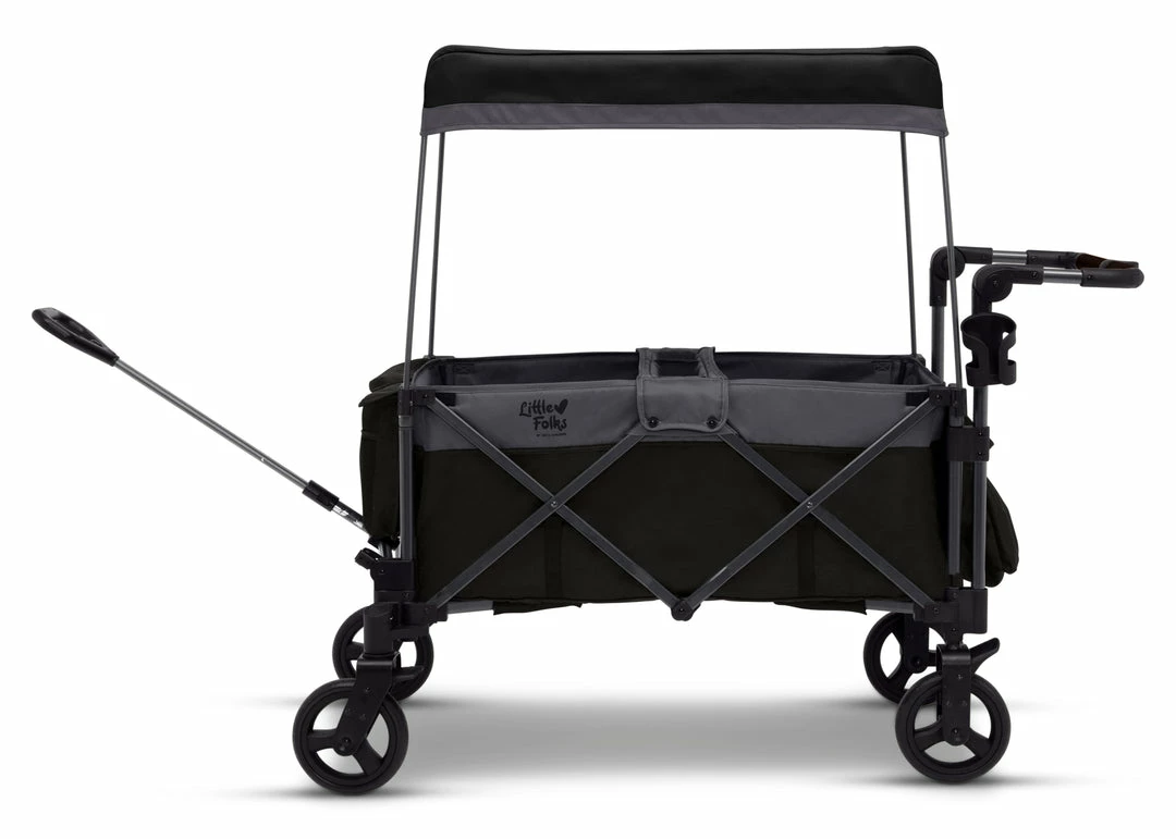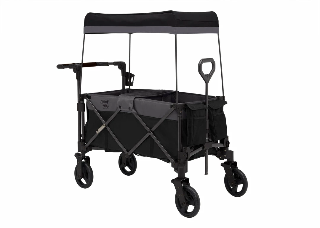 The Little Folks City Wagon Cruiser by Delta Children is specifically designed to grow and flow with your family. Packed with more features than a standard double stroller, this convenient wagon is perfect for indoor or outdoor activities. A comfy option for siblings or friends, this stroller wagon features two cushioned seats with 3-point safety harnesses for security while the removable center console with two cup holders and storage pocket allows kids to share snacks, toys and drinks. An additional cup holder for parents and side pockets ensure you can bring everything you need along for the adventure. The removable, UV blocking canopy and roll-down shades offer privacy and protection from the sun or rain. Easy to drive, it features swivel front wheels that allow you to effortlessly turn and pivot, as well as push and pull handles with adjustable heights. The wagon’s compact fold makes it easy to store or transport. And when your children outgrow the need for a wagon, use it to haul your own gear at the farmers market, while gardening or the grocery store. Holds up to 110 lbs. (55 lbs. per seat). Weighs 36.3 lbs. Recommended for ages 9 months up to 55 lbs.