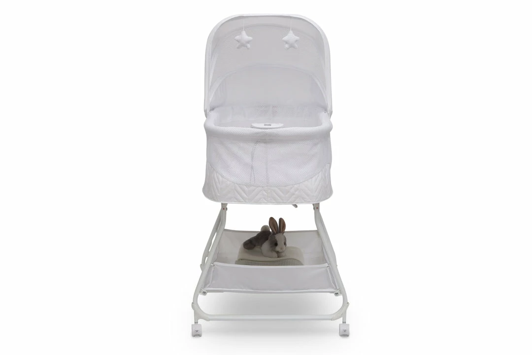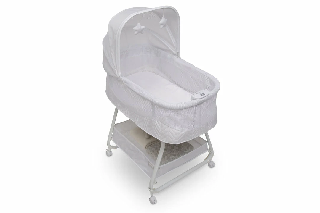 The Simmons Kids Airflow Auto Motion Bassinet is a modern close-to-the bed sleeper that boasts tons of calming and convenient features! Designed to help your baby fall asleep faster and stay asleep longer, the hands-free auto-glide motion helps soothe your baby—choose from two speeds that run for 60-minute intervals. The attached electronic pod features a soft nightlight and eight music and sound options that you and your baby will love. Breathable mesh sides all around provide increased airflow and a clear view of your sleeping baby while the adjustable canopy blocks light during naptime. Hanging plush stars on the canopy will engage and delight your baby if they wake up in the middle of the night. Other stand-out features include: large storage basket, comfortable 1-inch waterproof mattress pad with machine washable fitted sheet and wheels that make it easy to move around the house. This bassinet is recommended for babies 0-5 months. Max weight 30 lbs. Stop use at 5 months or once your infant begins to push up on their hands and knees, whichever comes first.