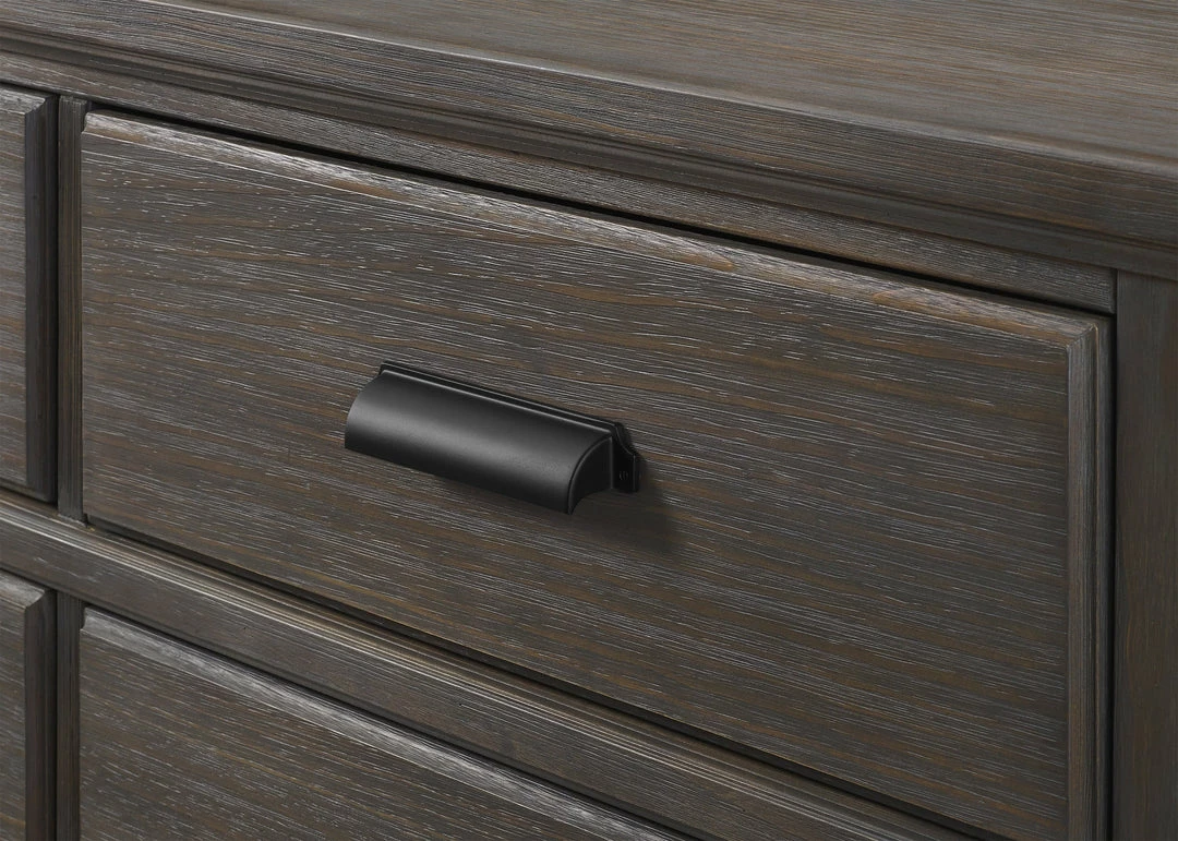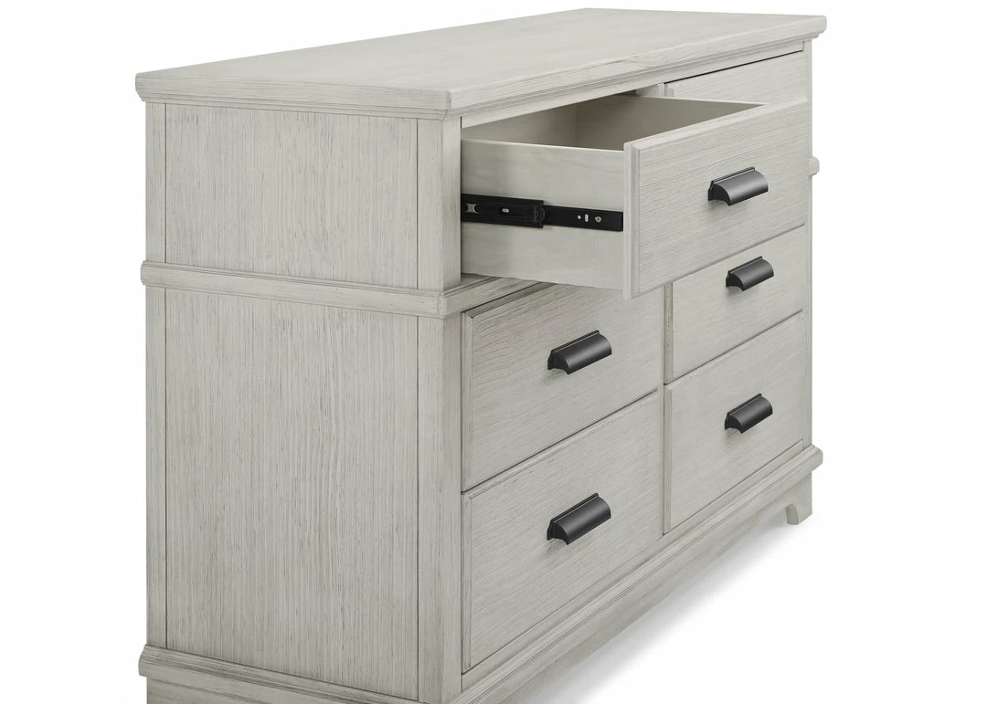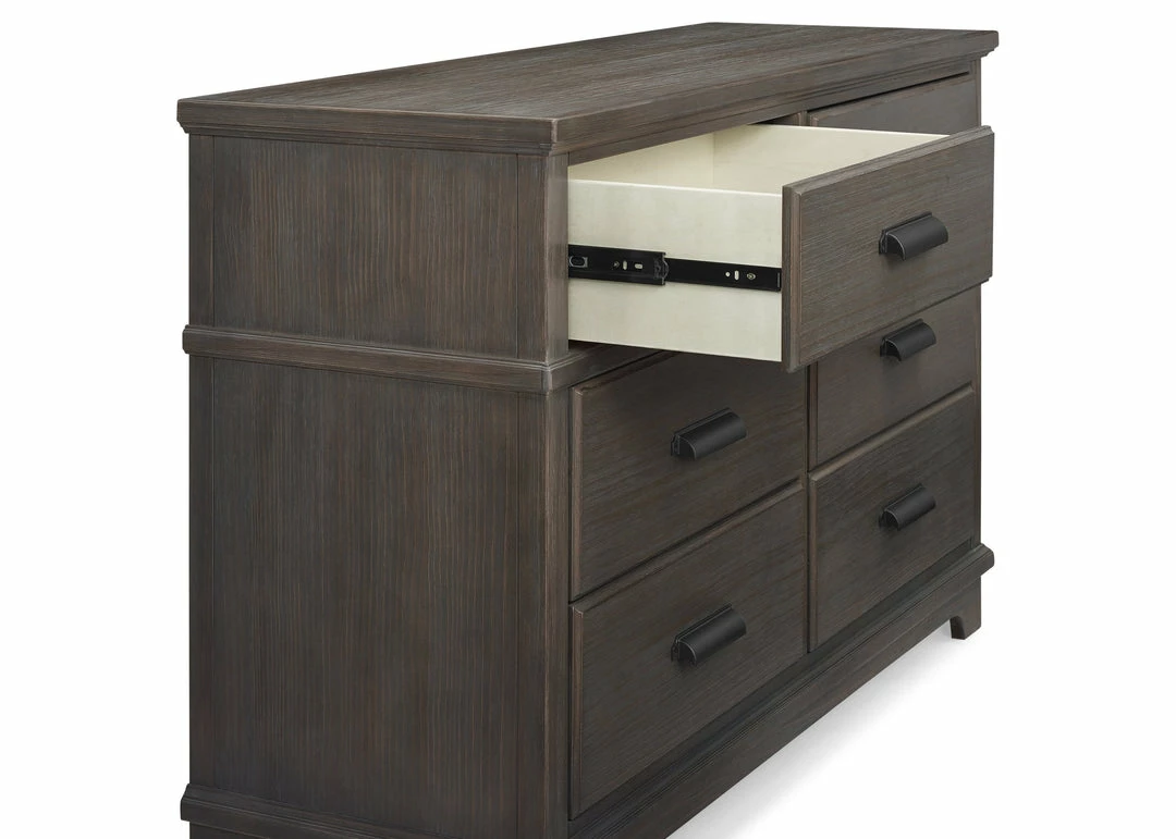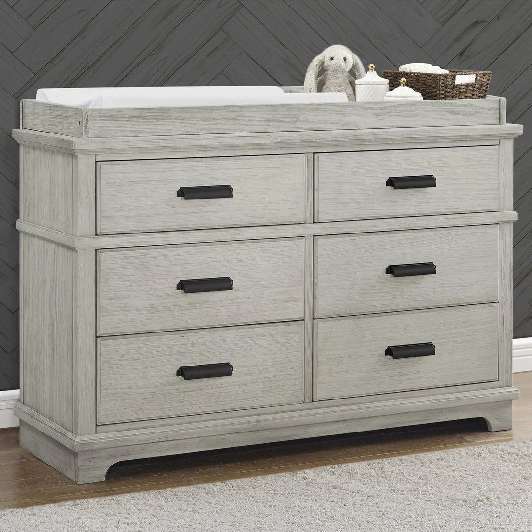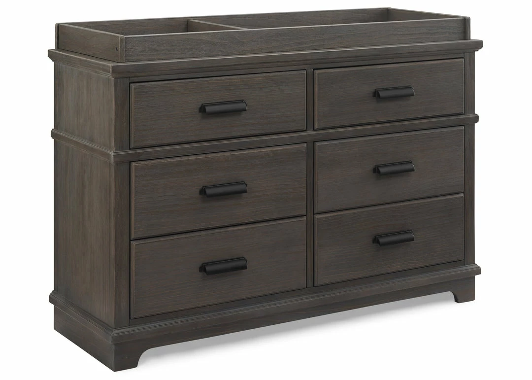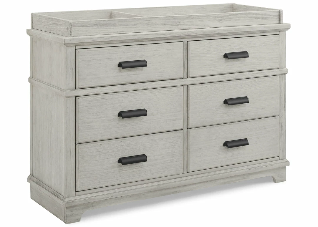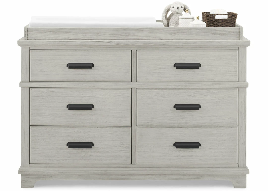 The Asher 6 Drawer Dresser with Changing Top by Simmons Kids adds modern farmhouse charm to any baby nursery or kids’ bedroom. A softy textured, hand applied finish and sleek matte black metal cup handles offer an updated take on rustic design. The Asher 6 Drawer Dresser includes a removable changing top that creates the perfect space for diaper changing now and is easily detachable, so you can create a more grown-up space later on. Pair this dresser with the Simmons Kids Asher 6-in-1 Convertible Crib for a coordinated look. Given the hand applied nature of this dresser’s finish, variations in the wood are to be expected and celebrated.