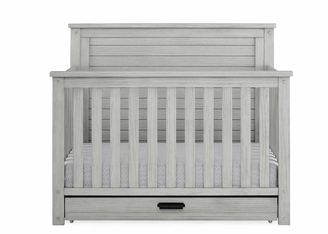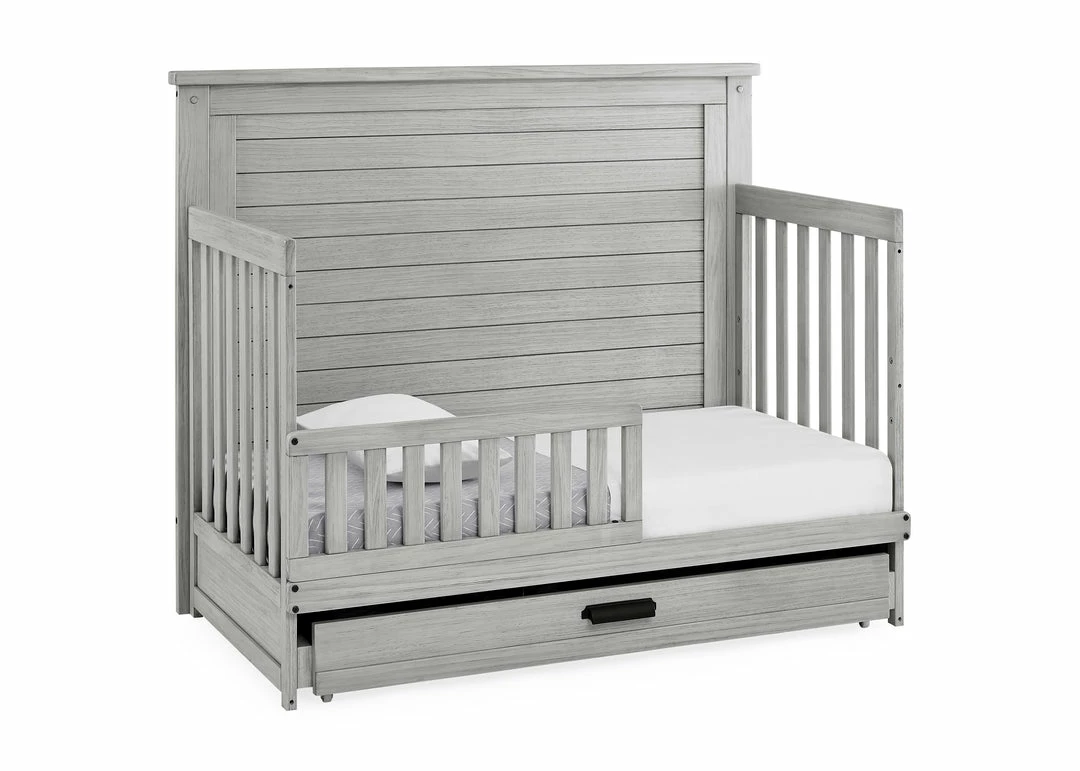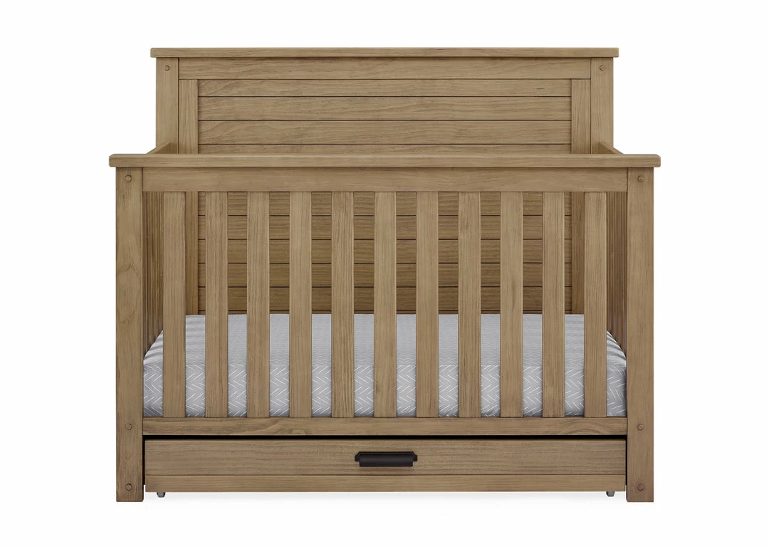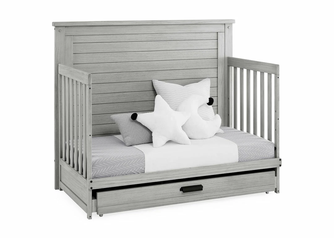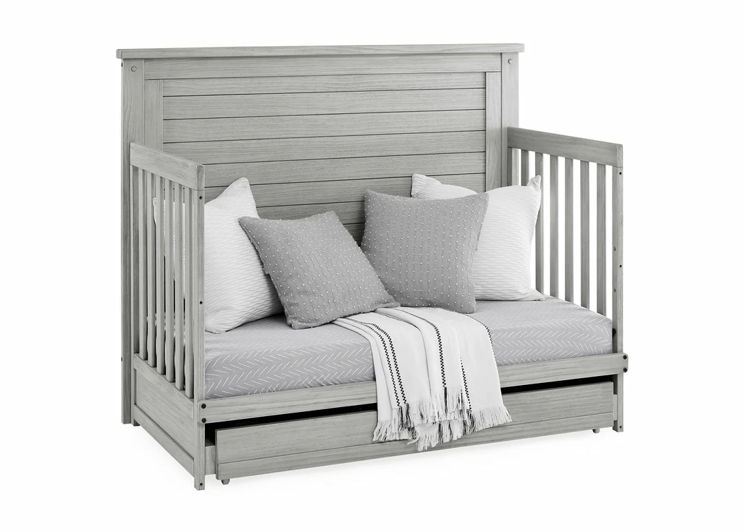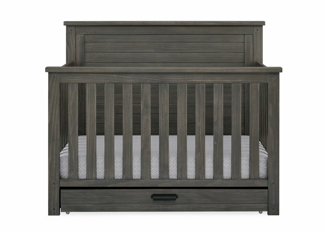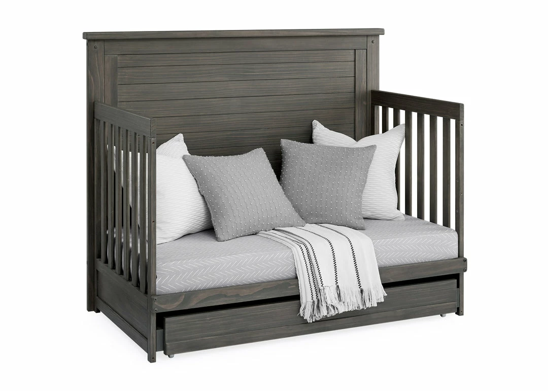The Caden 6-in-1 Convertible Crib with Trundle Drawer by Simmons Kids is designed with lasting, farmhouse style. The crib’s softy textured finish is hand-applied for a rustic look while the included trundle drawer adds additional functionality with space to store extra blankets and other bed linens. Plus, it will accommodate your baby from birth through their teenage years. This crib’s grow-with-me design features three adjustable height levels that allow the crib to be lowered as your child begins to stand, and it converts from a crib to a toddler bed, sofa, daybed and full size bed with headboard and footboard or headboard only. Available in Rustic Grey, Rustic Mist and Rustic Acorn. Daybed Rail and Trundle included; Toddler Guardrail #W100726, Full Size Bed Rails #330750 sold separately.