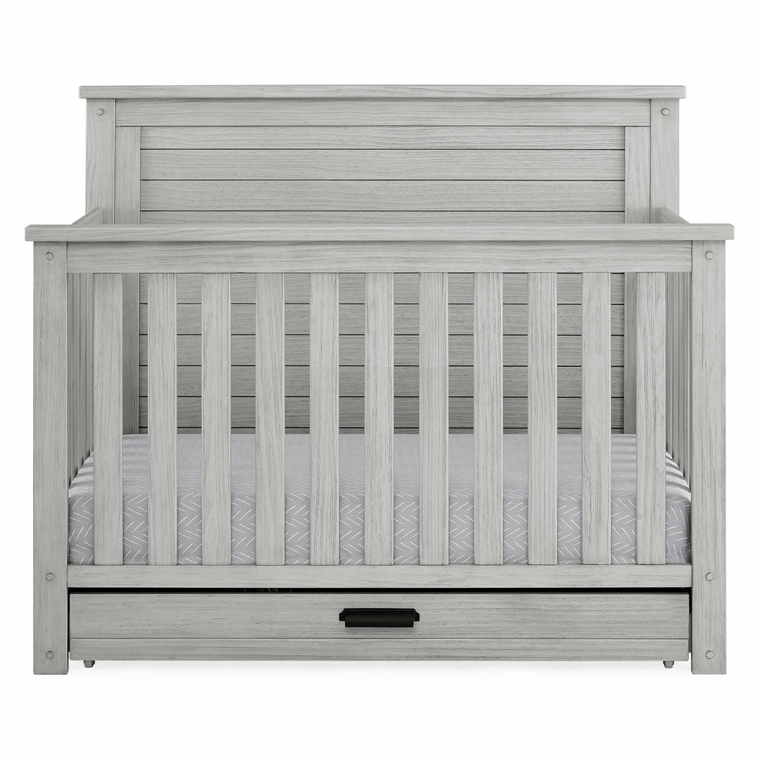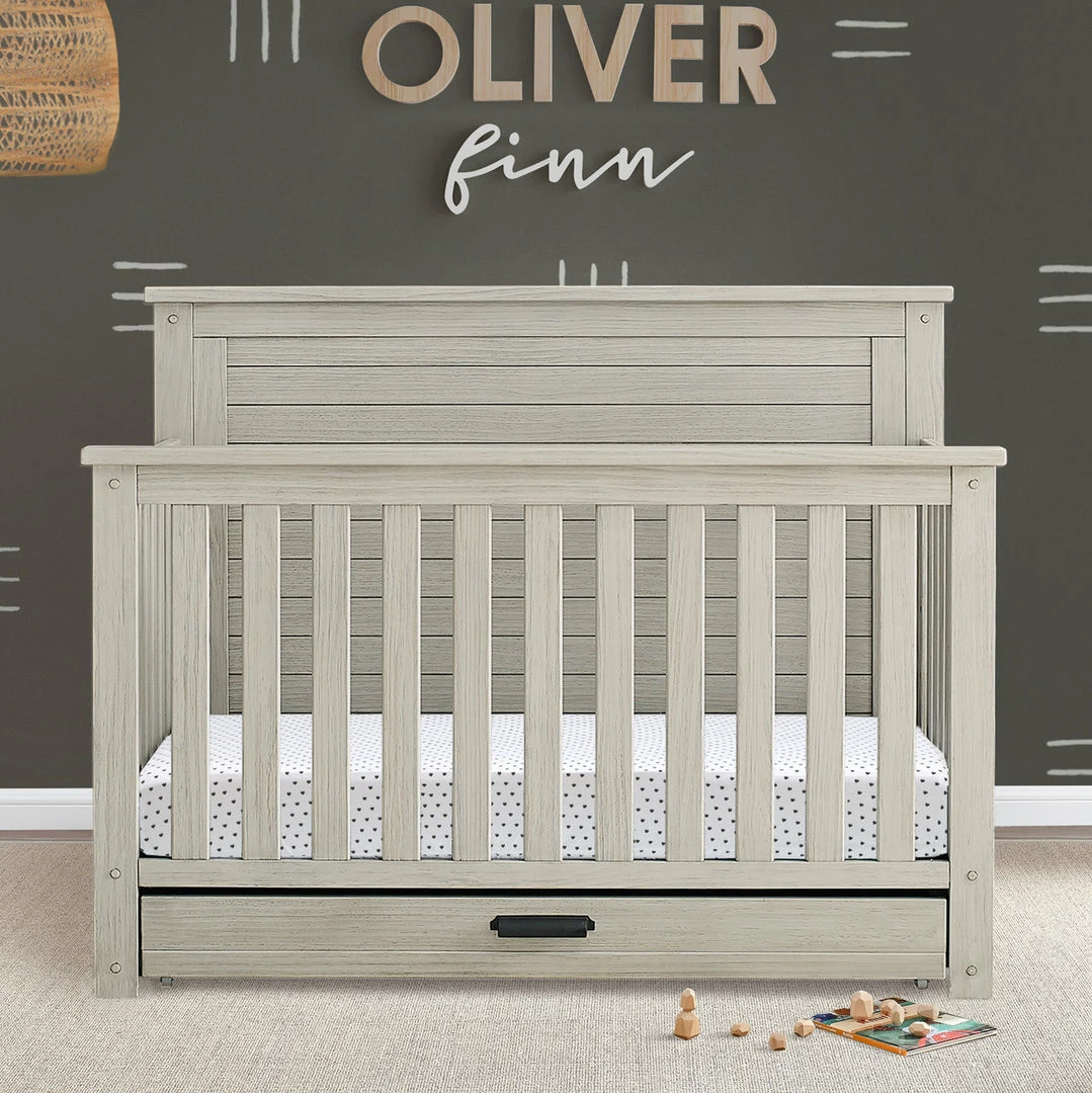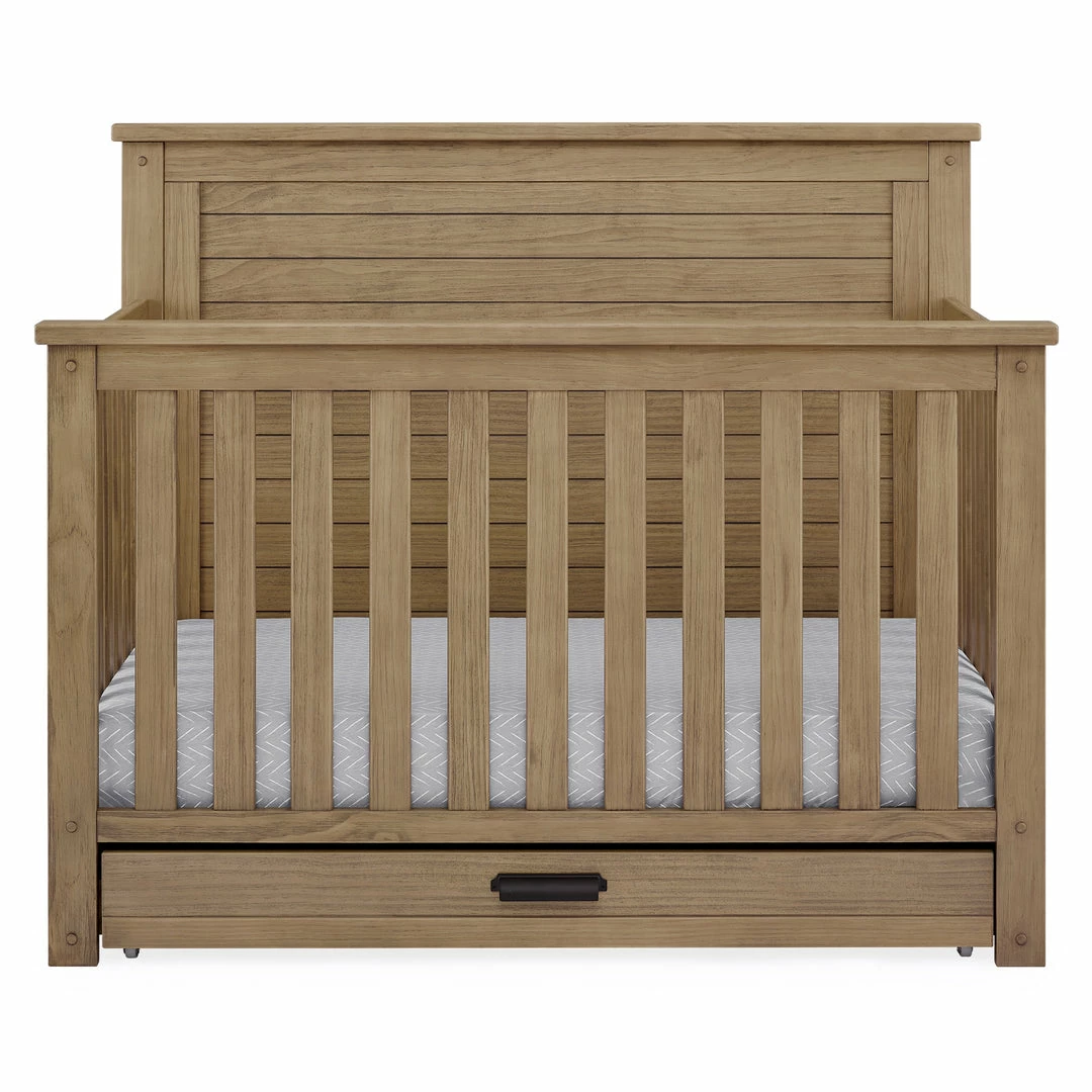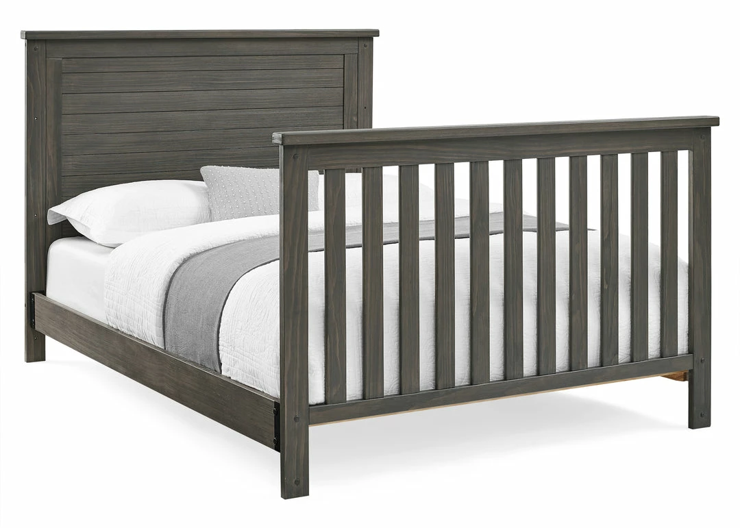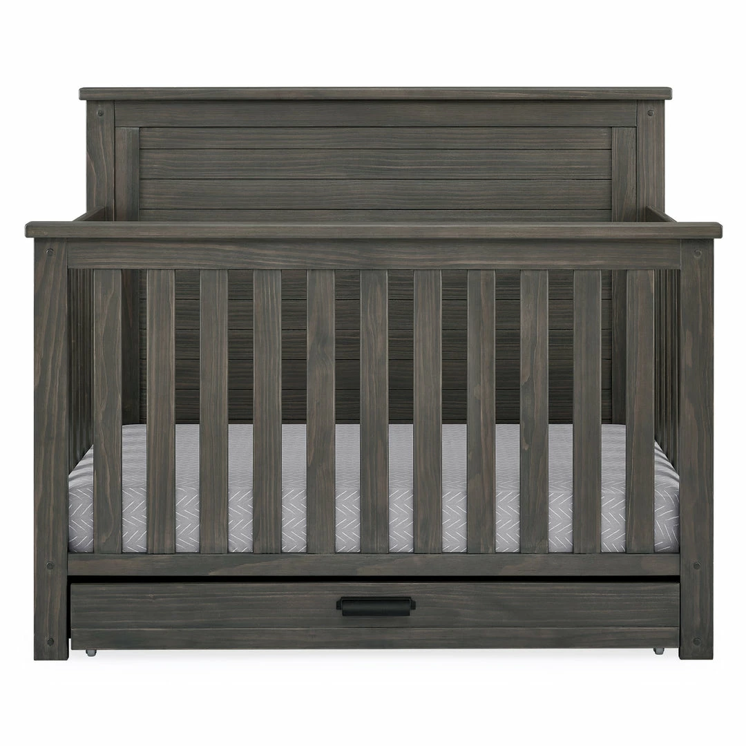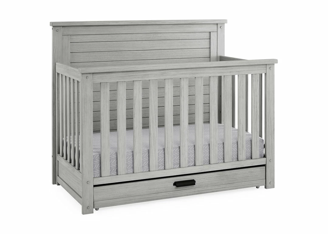The Caden 6-in-1 Convertible Crib with Trundle Drawer by Simmons Kids is designed with lasting, farmhouse style. The crib’s softy textured finish is hand-applied for a rustic look while the included trundle drawer adds additional functionality with space to store extra blankets and other bed linens. Plus, it will accommodate your baby from birth through their teenage years. This crib’s grow-with-me design features three adjustable height levels that allow the crib to be lowered as your child begins to stand, and it converts from a crib to a toddler bed, sofa, daybed and full size bed with headboard and footboard or headboard only. Available in Rustic Grey, Rustic Mist and Rustic Acorn. Daybed Rail and Trundle included; Toddler Guardrail #W100726, Full Size Bed Rails #330750 sold separately.