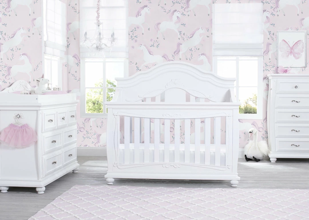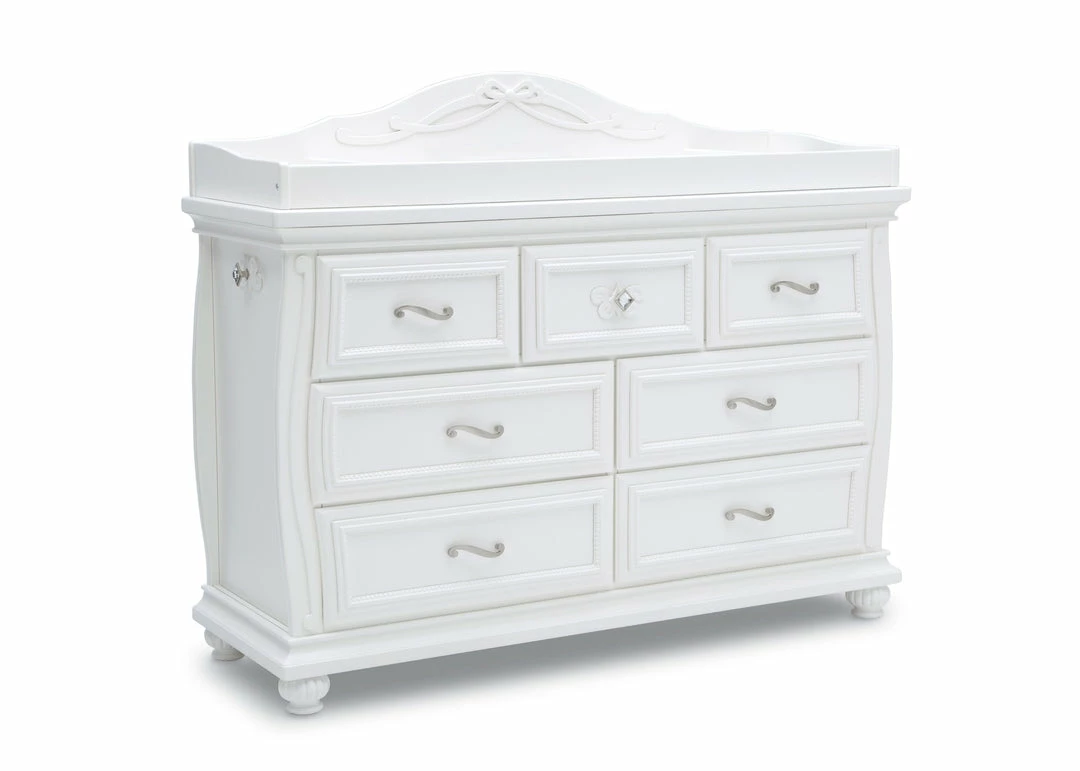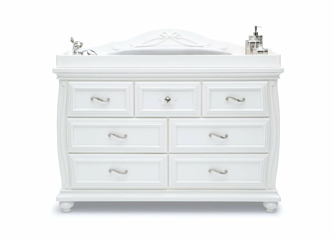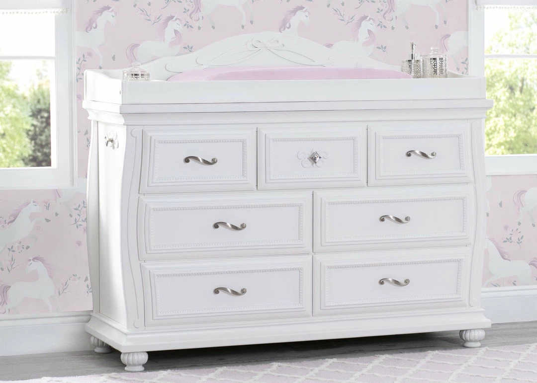 The Fairytale 7 Drawer Dresser with Changing Top will be the crown jewel of any bedroom. Seven sliding drawers with satin nickel pulls open to reveal a wealth of storage within. Acrylic knobs on each side of the dresser provide additional storage space to hang changing accessories, like towels or burp clothes. The included changing top provides a convenient and safe place to dress or change your baby’s diapers—and its felt lined bottom protects the dresser’s surface. Remove the changing top once your child outgrows the needs for a changing table