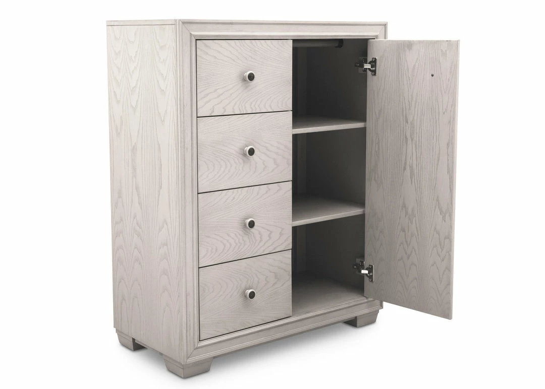 The Ravello 4 Drawer Combo Chest from Simmons Kids will fill your nursery with a sense of warmth. From an antique finish to a solid wood frame construction, this versatile storage unit channels the charm of the Italian coast. Four drawers with soft close drawer glides and a separate closet space with hanging bar will keep clothes and accessories tidy and out of sight.